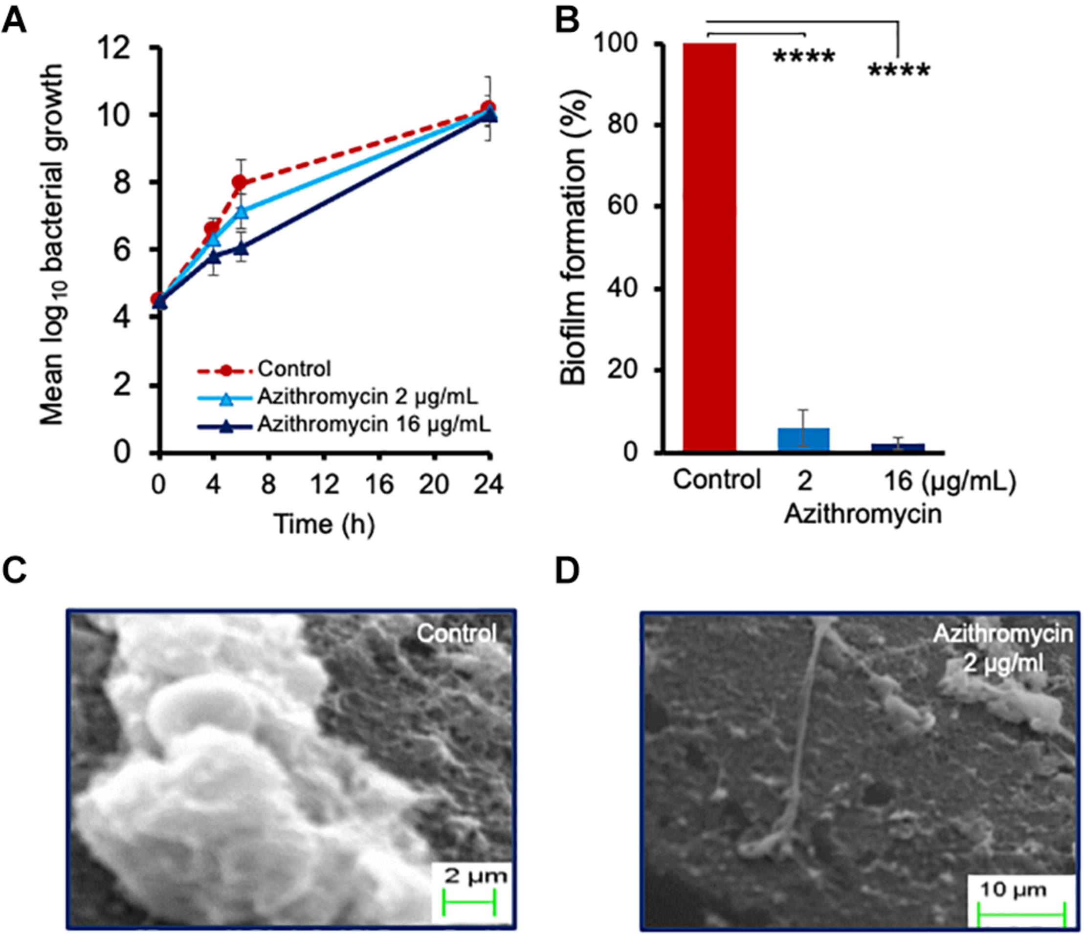 Figure 2. Activity of azithromycin against planktonic cells of P. aeruginosa PA14 (A), and biofilm formation (B) at 24 h. Scanning electron micrographs revealing biofilm formation at 24 h in absence of drug (C) or in presence of azithromycin (D). The catheter piece in drug-free control well shows production of extracellular matrix and biofilm formation, while no extracellular biofilm matrix and biofilm formation observed in presence of azithromycin. Each value is the average of triplicate assay where presented data is mean ± SD. Statistical analysis were calculated using one way ANOVA and ****p < 0.0001 (n = 3).