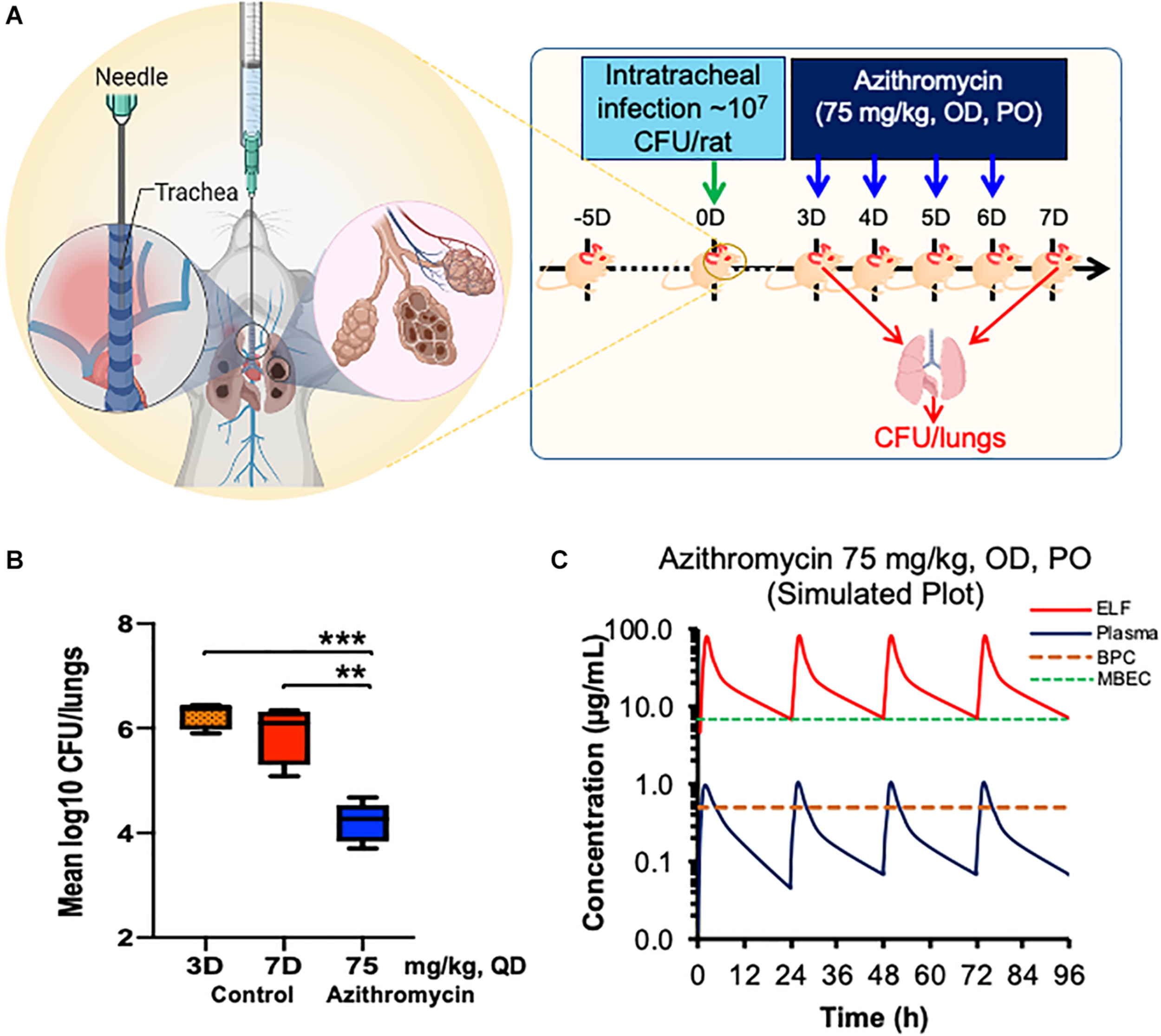 Figure 4. Efficacy of azithromycin in chronic rat pulmonary infection model of P. aeruginosa PA-14.Chronic pulmonary was caused using P aeruginosaPA-14 in rats via the intratracheally route and treatment was started 3 days post infection with azithromycin by PO route (A). Bacterial lungs loads were determined post 22 h of last dose and compared with those of placebo treated (B). Stimulated plasma and ELF concentration of azithromycin at 75 mg/kg, PO for 4 days was calculated using WinNonlin (C). The asterisks indicates a significant difference compared with those of control group (**P < 0.01, ***P < 0.001). CFU, Colony Forming Unit; OD, Once a Day; PO, Per Orem (Oral administration); ELF, Epithelial Lining Fluid; BPC, Biofilm Preventive Concentration; MBEC, Minimal Biofilm Eradication Concentration.