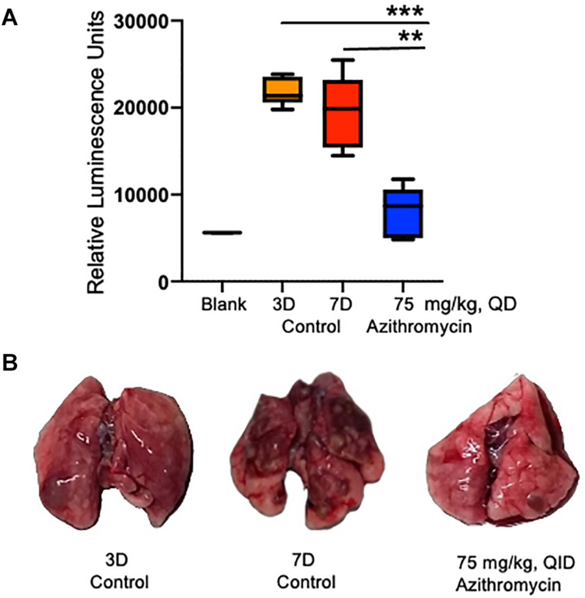 Figure 5. Detection of QS molecule in the epithelial lining fluid (ELF) of infected rats. QS molecule was determined 3 days post-infection, when the treatment was started and at 7 days post-infection in the placebo control and azithromycin treated rats (A). Representative lungs photos of 3D, 7D and azithromycin treated rats (B). The asterisks indicates a significant difference compared with those of 7D control group (**P < 0.01, ***P < 0.001).