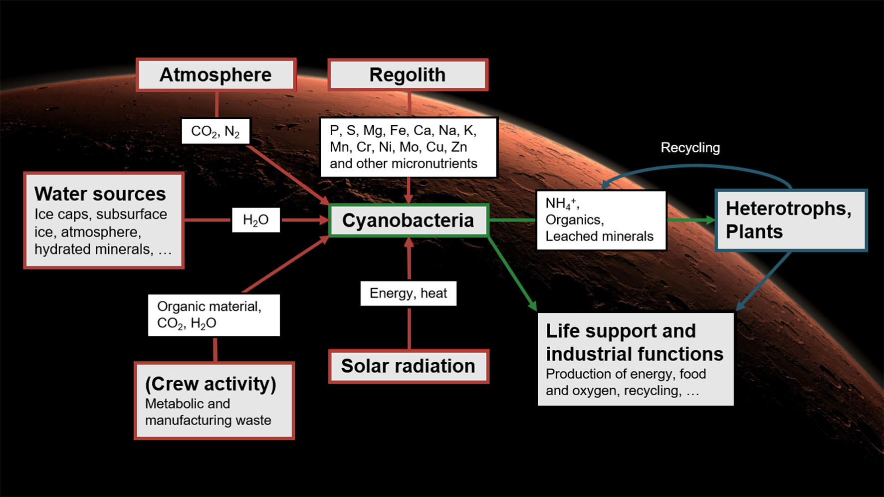 Cyanobacterium-based life-support systems on Mars: using cyanobacteria fed with local resources to decrease the dependence on Earth-imported materials of future long-duration, crewed missions. The concept was described in detail by Verseux et al. (2016a). Reproduced from Verseux (2020b) with permission from the editor (Figure 12.1, p. 290).