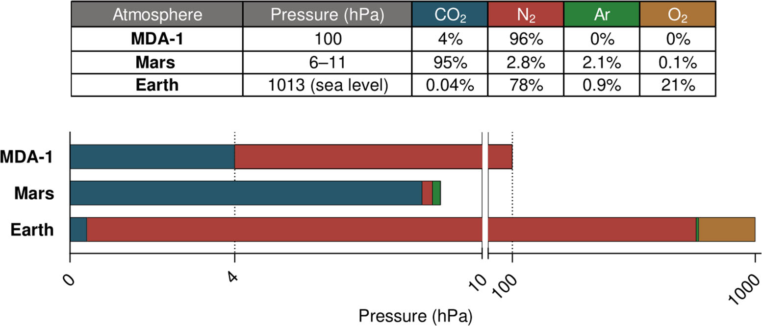 Comparison of Earth, Mars, and MDA-1 atmospheres. The scale of the bar graph is linear over each of both segments (0–10 and 10–1,020 hPa). Gas proportions in the table are given in volume percent; data for Mars are from Franz et al. (2017), those for Earth from NOAA et al. (1976) and NOAA (2020).