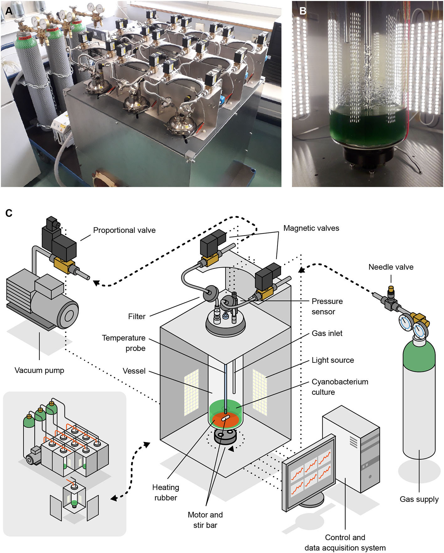 Photographs (A,B) and schemes (C) of Atmos, the low-pressure photobioreactor we developed and used in this study. Shown are an overview of the device (A; bottom-left section of C) and the inside of one of the 9 vessel compartments (B; main section of C). Artwork by Joris Wegner (University of the Arts Bremen).
