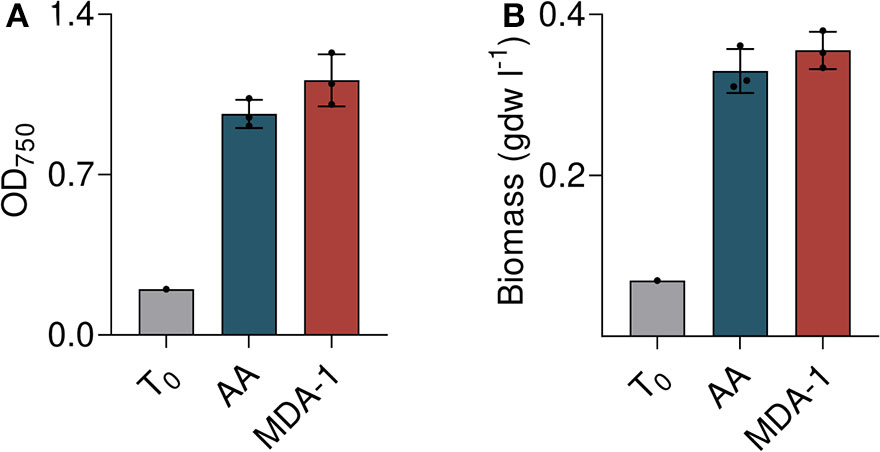 Growth of Anabaena sp. under ambient atmosphere (AA) and MDA-1, at cultivation onset (T0; calculated from measured values of the inoculum) and after 10 days, as assessed by optical density at 750 nm (OD750; A) and biomass concentration (B) after correction for evaporation. Columns and error bars represent mean values of, and standard deviations across, three biological replicates. Values for biological replicates (dots) are the average of three measurements each. Differences between both atmospheric conditions are non-significant (two-tailed t-tests, p > 0.05).