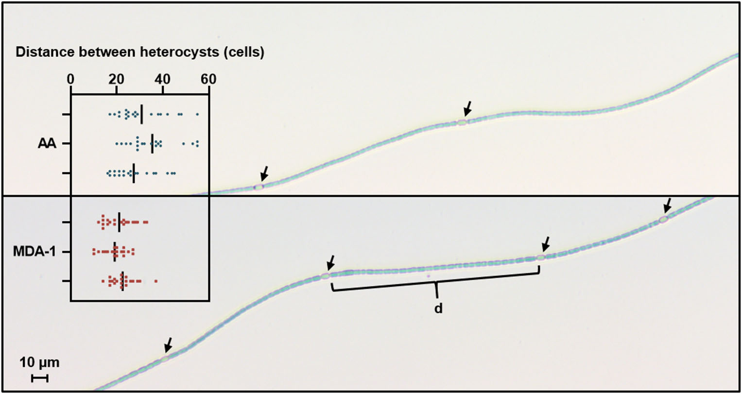 Microscopy images of Anabaena sp. filaments grown for 10 days under ambient atmosphere (AA, top) or MDA-1 (bottom), showing heterocysts (arrows) and vegetative cells. Bars in the scatter plot give the distance between heterocysts, defined as the average number of cells in the interval (d) separating adjacent heterocysts along a filament, for three biological replicates. Symbols show values for 20 measurements per biological replicate. Overall averages are 31.2 ± 4.0 and 20.9 ± 1.7 cells for AA and MDA-1, respectively. The difference is significant (two-tailed t-test, p < 0.05).