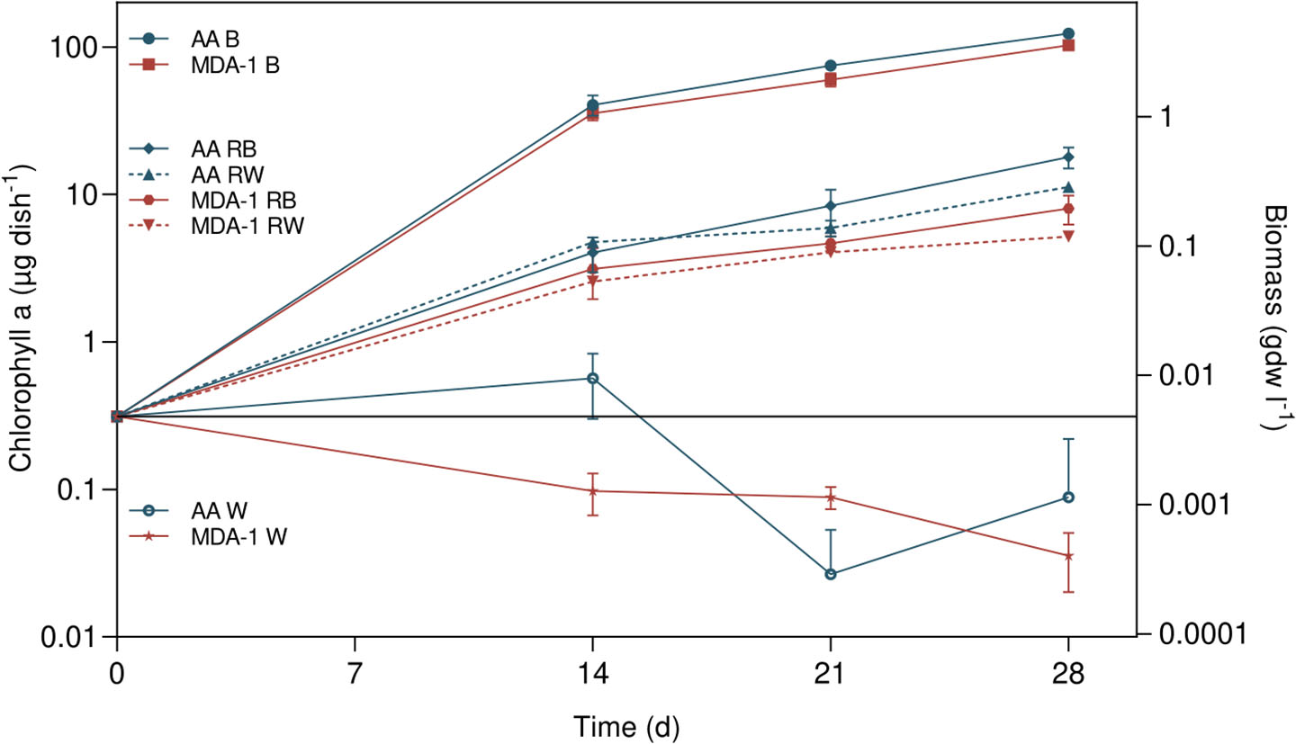 Growth took place in all inoculated samples containing BG110, MGS-1 in BG110, or MGS-1 in water: amounts of chlorophyll a, initially of 0.3 μg of chlorophyll a per dish (μg chl. a dish−1), increased over time (Figure 7). On the contrary, final chlorophyll a amounts in inoculated water without MGS-1 were lower than amounts at the onset of the experiment.