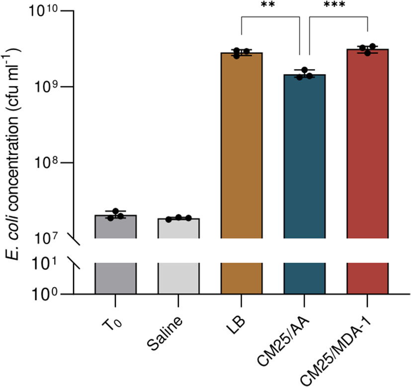 Cell concentrations of E. coli at culture onset (T0) and after overnight incubation in saline solution (Saline), standard medium (LB), or a filtered lysate of Anabaena sp. previously grown under either ambient atmosphere (CM25/AA) or MDA-1 (CM25/MDA-1). Columns and error bars represent mean values of, and standard deviations across, three biological replicates. Dots show values for individual biological replicates. The cell concentration in CM25/AA differs significantly from those in CM25/MDA-1 and LB (Tukey test; ***, adjusted p < 0.001; **, adjusted p < 0.01); differences between CM25/MDA-1 and LB are non-significant (p > 0.05). cfu, colony forming units.