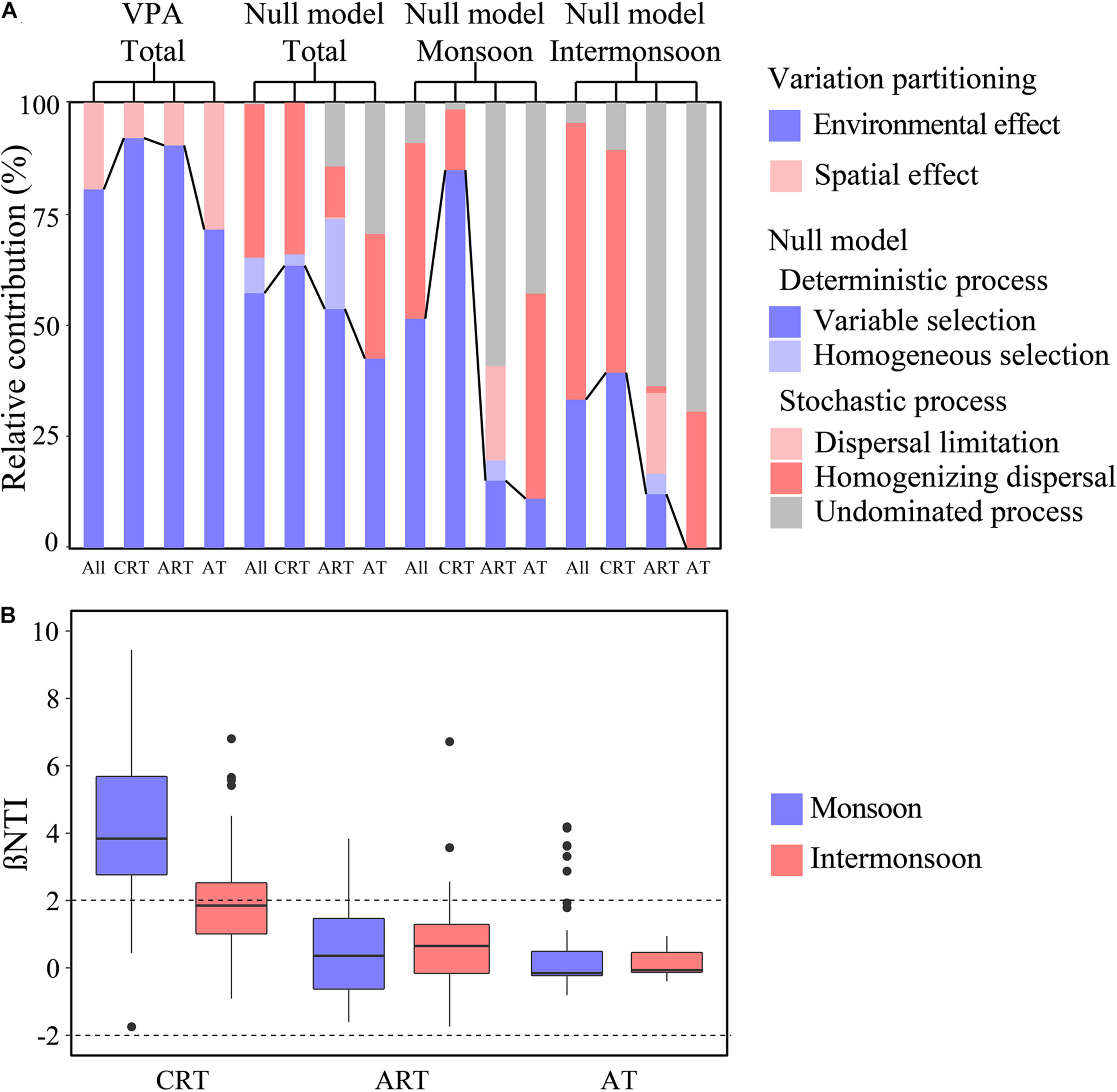Community assembly mechanisms for different taxa in the monsoon and intermonsoon. (A) The assembly processes of bacterial community in the EIO. Null model: community assembly processes were governed primarily by deterministic processes, including variable and homogeneous selection, and stochastic processes, consisting of dispersal limitations and homogenizing dispersal, as well as the undominated process that was not dominated by any single process. Variation partitioning analysis (VPA) depicting the relative contribution of environmental and spatial effects on microbial community assembly. (B) The seasonal patterns of βNTI for CRT, ART, and AT. CRT, conditionally rare taxa; ART, always rare taxa; AT, abundant taxa.
