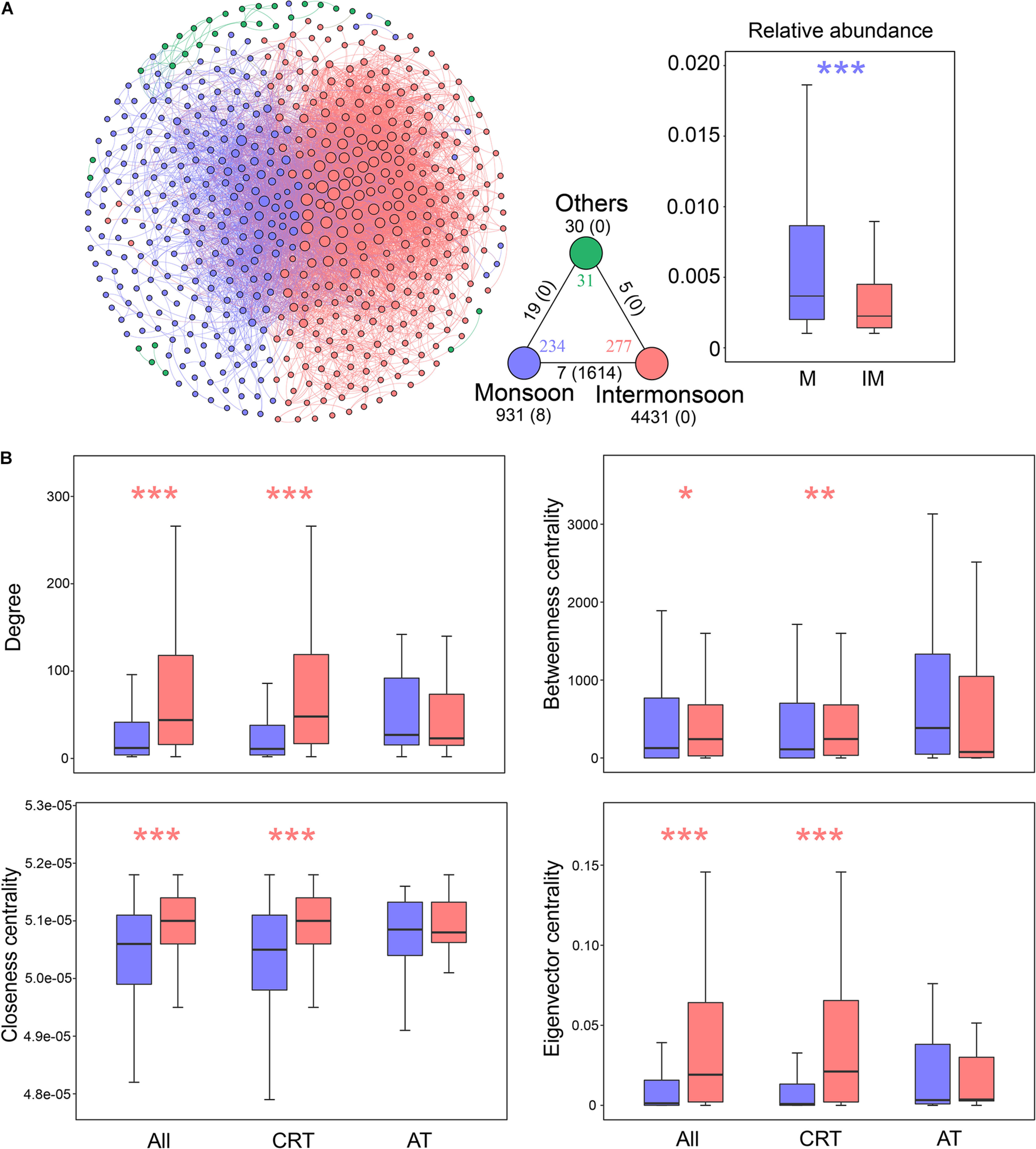 Properties of the co-occurrence network in bacterial communities during the monsoon and intermonsoon periods. (A) The network was conducted by strong (Spearman’s | r| > 0.8) and significant (p-value < 0.01) correlations between OTUs in the metacommunity. Each node represents an OTU, and each edge represents a correlation. The size of nodes is proportional to the degree of corresponding OTUs (the number of connections). The networks were colored based on monsoon or intermonsoon enriched OTUs, showing the intra-associations within each season and inter-associations between the two seasons. The triangle located at the bottom right of the network figure is a summary of the intra-associations and inter-associations. Colored numbers indicate the number of nodes belonging to the corresponding category (i.e., there were 234 nodes in the “monsoon” category). Numbers outside and inside parentheses, respectively, indicate the numbers of positive edges and negative edges. Black numbers near the apex of the triangle in turn indicate the number of intra-associations. Numbers near the triangle edge in turn indicate the number of cross-group interactions. The boxplot showing the relative abundance of seasonal enriched OTUs. (B) Seasonal comparison of node-level topological features among metacommunity and subcommunities. Blue asterisks indicate the values significantly higher in monsoon-enriched taxa (*p < 0.05; **p < 0.01; ***p < 0.001; Wilcoxon rank-sum test); red asterisks indicate the properties significantly higher in intermonsoon-enriched taxa. Monsoon, monsoon-enriched OTUs; Intermonsoon, intermonsoon-enriched OTUs; Others, OTUs not specific to a group. RT, rare taxa; AT, abundant taxa.