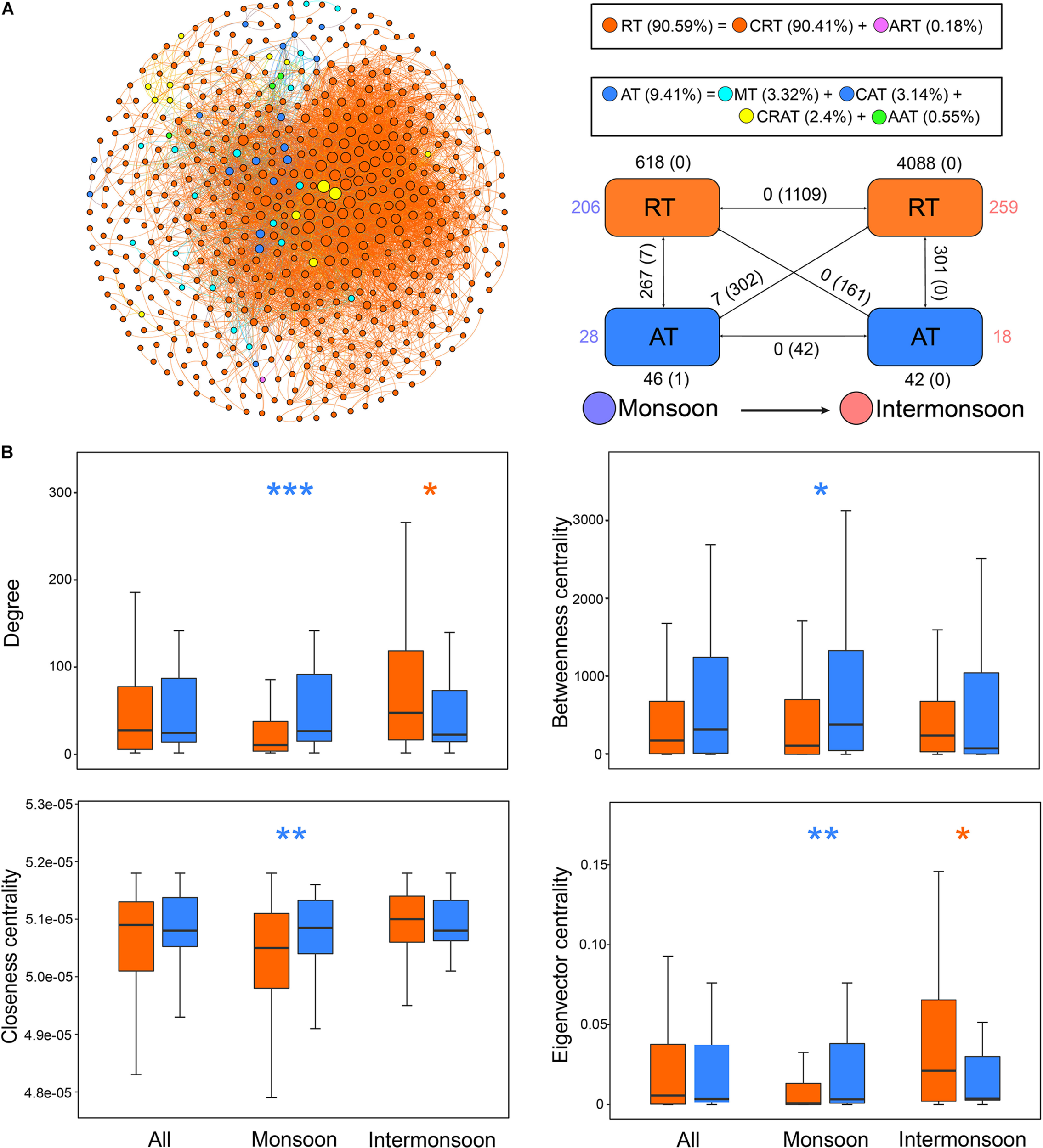 Different roles of rare taxa and abundant taxa in the co-occurrence network. (A) The network was conducted by strong (Spearman’s | r| > 0.8) and significant (p-value < 0.01) correlations between OTUs in the metacommunity. Each node represents an OTU, and each edge represents a correlation. The size of nodes is proportional to the degree of corresponding OTUs (the number of connections). The networks were colored based on the relative abundance of OTUs, showing seasonal variation through the intra-associations within each taxon and inter-associations between two taxa. The rectangle located at the bottom right of the network figure is a summary of the intra-associations and inter-associations. Colored numbers indicate the number of nodes belonging to the corresponding category (i.e., there were 206 RT nodes in the “monsoon” category). Numbers outside and inside parentheses, respectively, indicate the numbers of positive edges and negative edges. Black numbers near the apex of the rectangle in turn indicate the number of intra-associations. Numbers near rectangle edge in turn indicate the number of cross-group interactions. (B) Comparison of node-level topological features among metacommunity and subcommunities for rare taxa and abundant taxa. Blue asterisks indicate the values significantly higher in abundant taxa (*p < 0.05; **p < 0.01; ***p < 0.001; Wilcoxon rank-sum test or Brown Mood median test); orange asterisks indicate the properties significantly higher in rare taxa. RT, rare taxa; CRT, conditionally rare taxa; ART, always rare taxa. AT, abundant taxa; MT, moderate taxa; CAT, conditionally abundant taxa; CRAT, conditionally rare and abundant taxa; AAT, always abundant taxa.