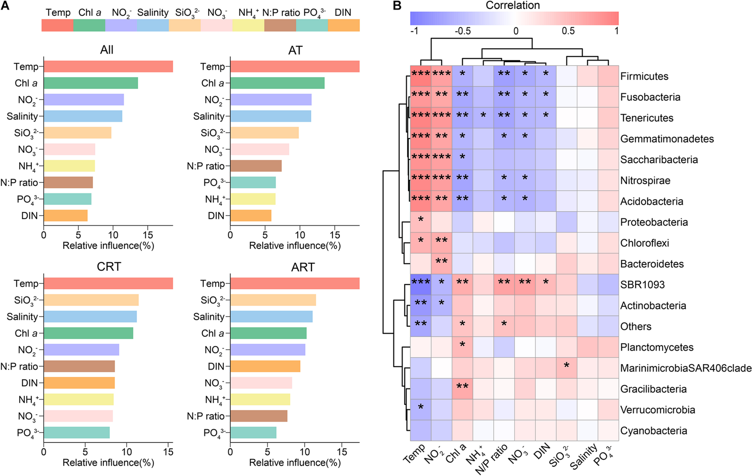 Drivers shaping the microbial communities. (A) Aggregated boosted tree (ABT) showing the relative contribution of environmental factors on the community composition. (B) The relationships between sea water properties and the relative abundances of microbial phyla based on Spearman correlation (*p < 0.05; **p < 0.01; ***p < 0.001).