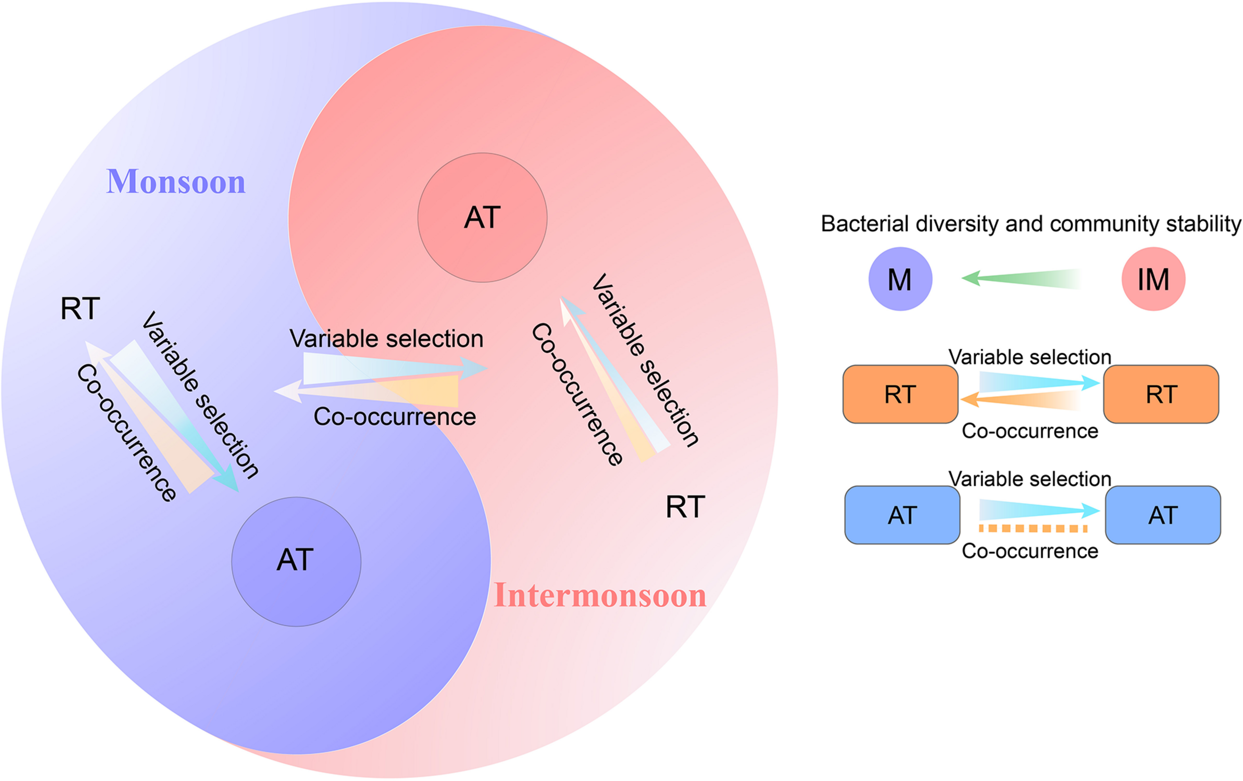 These results and assumptions together with previous paradigms (Jiao et al., 2020) lead us to propose a modified conceptual framework (Figure 6). By incorporating rare and AT into the linkages between assembly processes and species coexistence, the present study could improve our understanding of microbial communities in marine ecosystems for better response to climate change. Although the framework offers a potentially novel insight, we acknowledge several limitations in the study. For example, the framework is inferred based on limited data sets in the monsoon and intermonsoon. Exogenous selective forces may shift in strength and duration, with periodicities on differing time scales (Bell, 2010) and heterogeneities on differing space scales. The ecological patterns of different taxa may vary with the changing environment spanning different spatiotemporal scales. Meanwhile, samples from a single depth without multiple layers may make the results hard to represent the upper Indian Ocean (e.g., whether this framework suiting the DCM layer needs further research). Therefore, more samples based on large spatiotemporal scale are needed to comprehensively depict the horizontal, vertical, and seasonal variation of the microbial community in the EIO. Moreover, the assembly and co-occurrence patterns of abundant and rare bacterial community under different environments described here need to be validated with more research across a broad range of ecosystems.