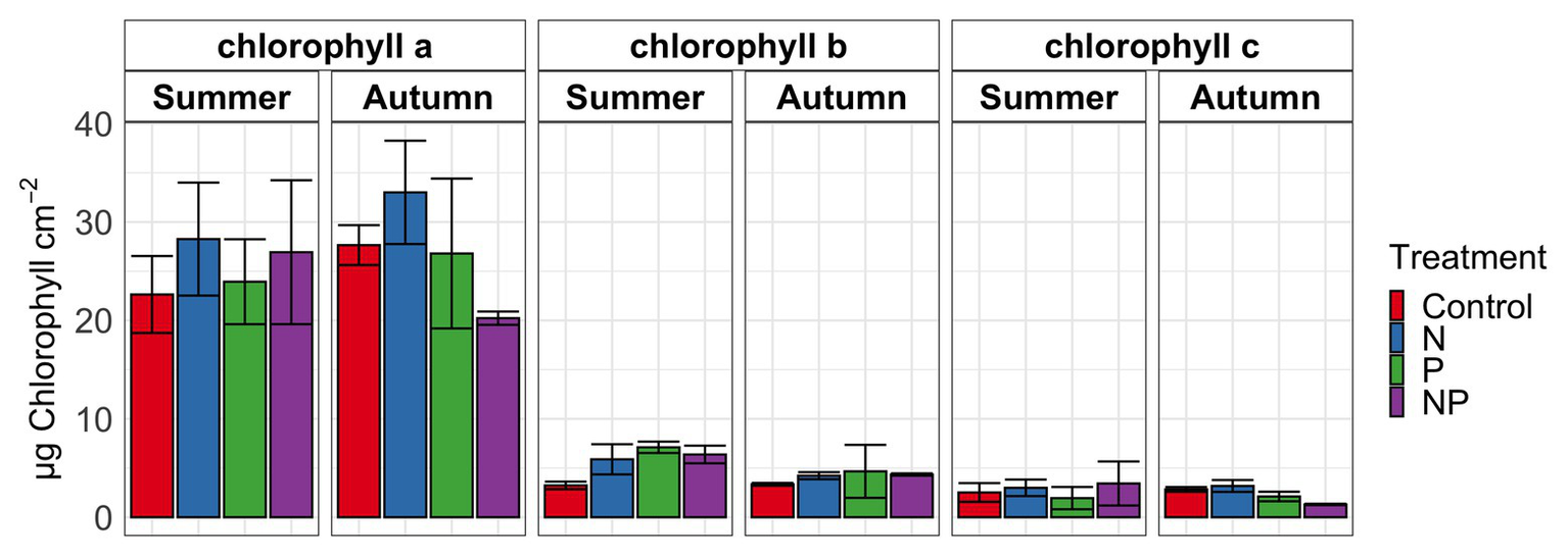 Chlorophyll a, b, and c in periphyton for summer and autumn experiments of control, nitrate (N), phosphate (P) and nitrate + phosphate (NP) nutrient exposures. Bars represent average of triplicates. Error bars represent standard deviation.