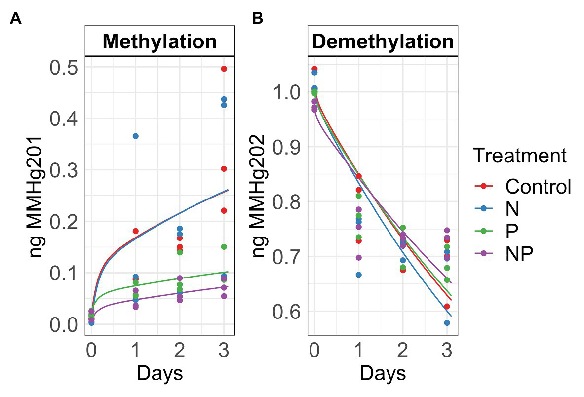 Autumn methylation (A) and demethylation (B) rates calculated with the Transient Availability Kinetic Model of control, nitrate (N), phosphate (P), and nitrate + phosphate (NP) nutrient exposures. The initial 201HgCl2 and MM202HgCl spikes were 1.8 μg and 1.05 ng, respectively.
