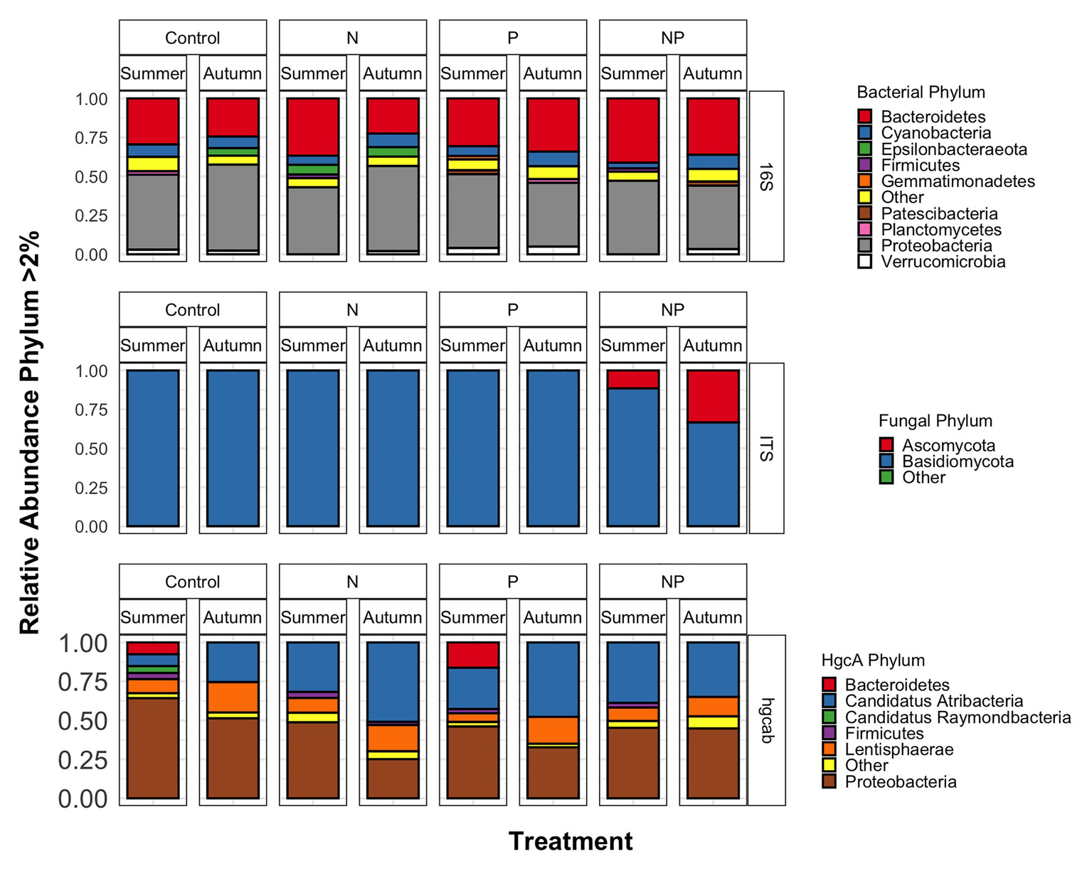 Phyla relative abundances of bacterial/archaeal (16S rRNA), fungal (ITS), and mercury methylating (hgcAB) microbial communities of control, nitrate (N), phosphate (P), and nitrate + phosphate (NP) nutrient exposures in summer and autumn experiments.