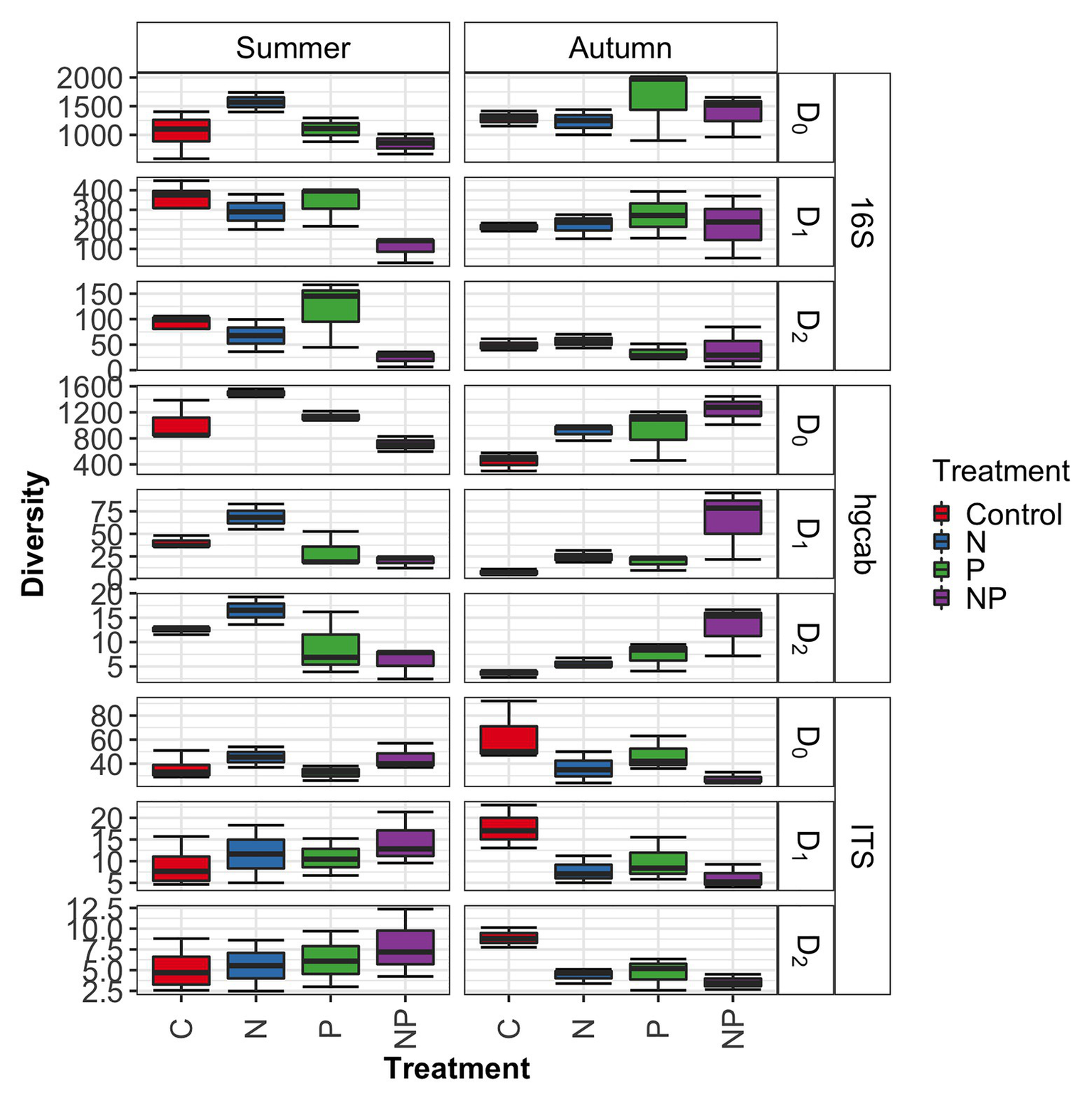 Microbiome diversity across control, nitrate (N), phosphate (P), and nitrate + phosphate (NP) nutrient exposure treatments and summer and autumn seasons measured by Hill’s numbers.