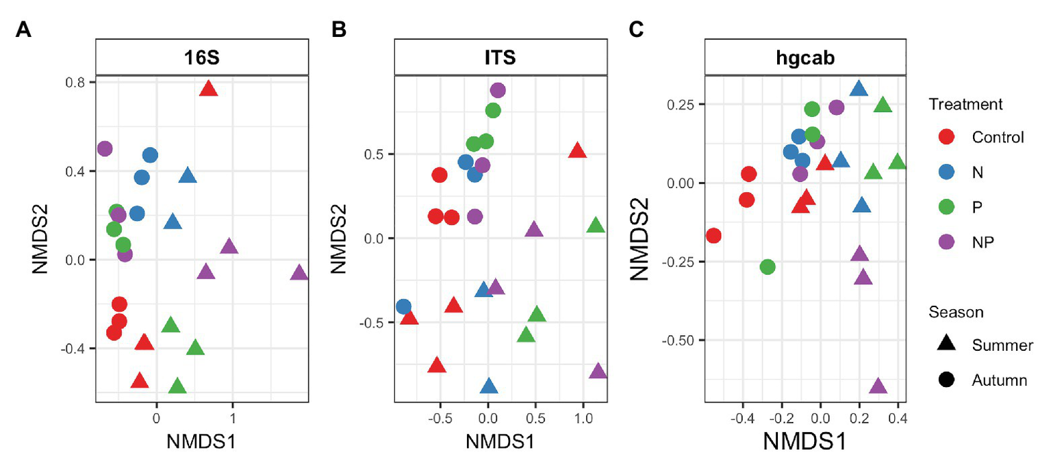 NMDS of Bray-Curtis dissimilarity of (A) bacteria/archaea (16S rRNA), (B) fungi (ITS), and (C) mercury methylating (hgcAB) periphyton communities of control, nitrate (N), phosphate (P), and nitrate + phosphate (NP) nutrient exposures in summer and autumn experiments. Color represents treatment while shape indicates the season periphyton was sampled.
