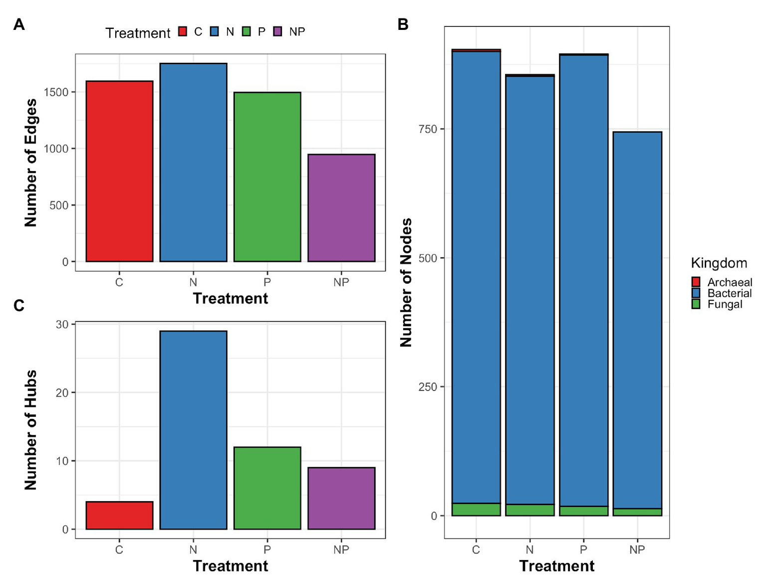 Summary of cross-domain correlation networks of periphyton archaea, bacteria, and fungal associations (edges; A) between microorganisms (nodes; B) as well as taxa with significantly higher interactions than other nodes (hubs; C) for control (C), nitrate (N), phosphate (P), and nitrate + phosphate (NP) nutrient exposure experiments.