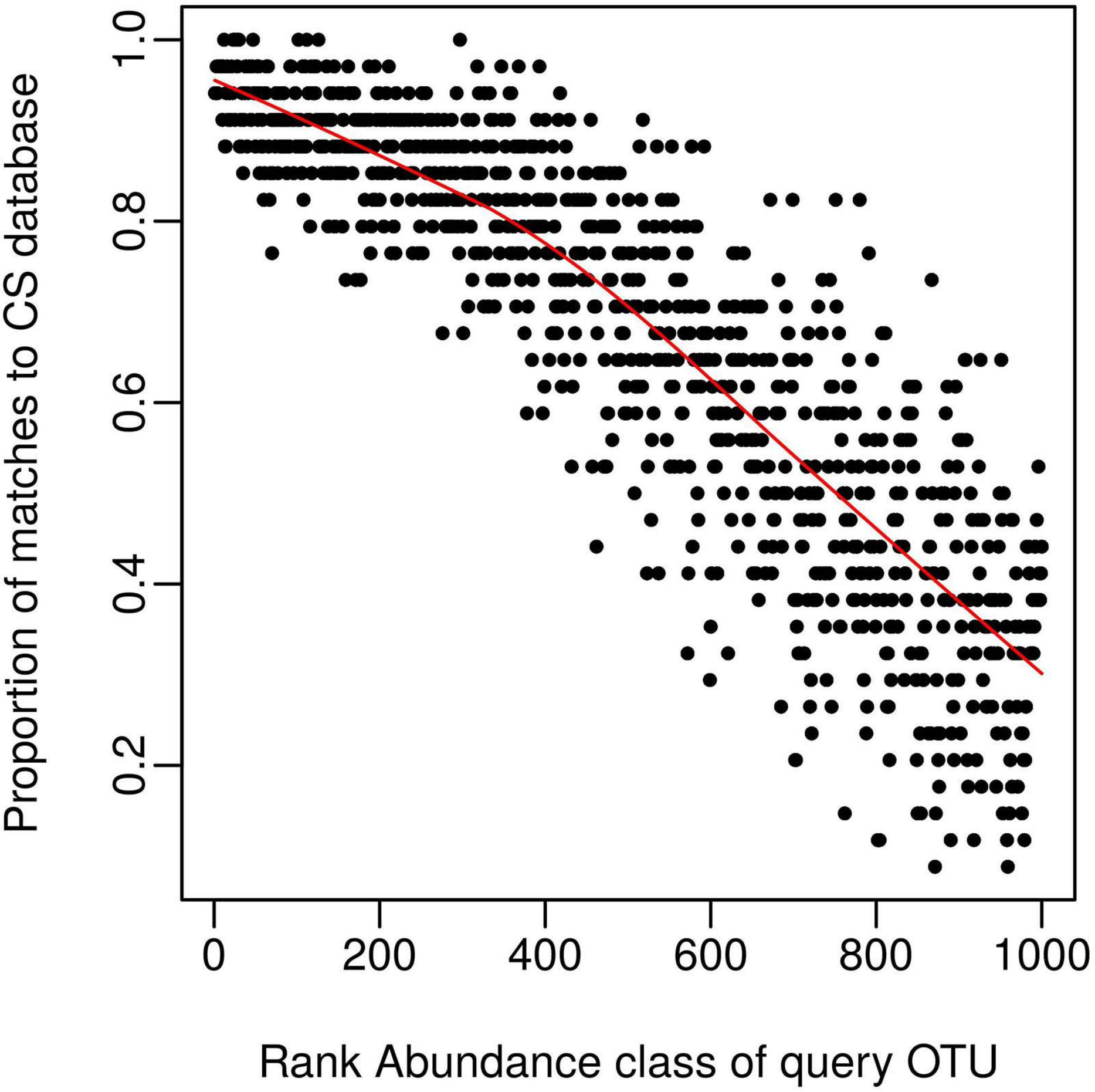 Figure 2. The CS database provides good coverage of dominant taxa within a query dataset. Query OTU reference sequences (dataset 1, Table 1) were grouped into 1,000 bins by decreasing rank (e.g., the 1000th bin contains the least abundant OTUs); and the proportion of each bin matching the CS dataset calculated and displayed on the y-axis. The proportion of matches to the CS database (> 97% similarity) declines as query taxa become rarer, despite the comprehensive nature of the CS database.