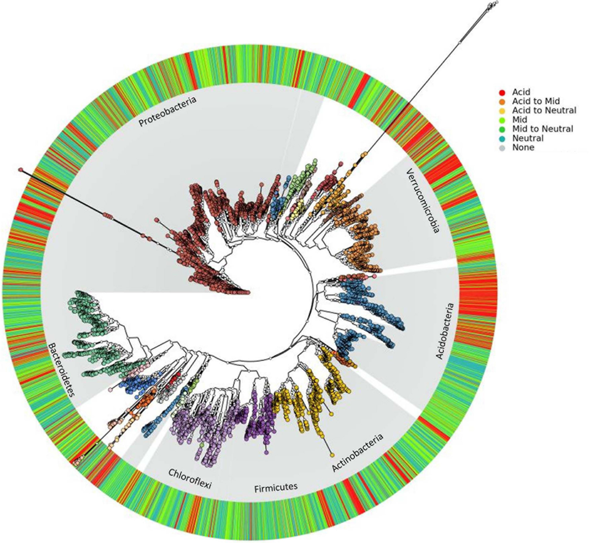 Figure 4. The phylogenetic distribution of bacterial pH optima. A phylogenetic tree of all OTUs present in > 100 samples (totaling 6,385 OTUs), with each OTU annotated according to pH classification based on HOF model optima (outer ring).