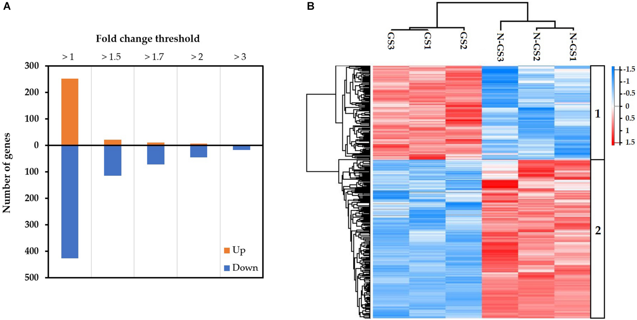 The transcripts were further analysed to identify differentially expressed transcripts in germinating spores relative to non-germinating spores. A total of 679 differentially expressed transcripts were identified during the germination of S. subterranea resting spores (FDR < 0.05). Among these 252 were upregulated and 427 downregulated (Figure 2A). A Heatmap generated from the normalised expression of aligned reads of germinating and non-germinating spores (n = 3) revealed hierarchical clustering of all the differentially expressed transcripts with P-value < 0.05. The analysis yielded two major clusters of transcripts showing distinct patterns between germinating and non-germinating spores of S. subterranea. Cluster 1 contains transcripts with expression levels peaking in germinating spores (Figure 2B, top). Cluster 2 contains transcripts that had high expression levels in non-germinating spores, but low levels during germination (Figure 2B, bottom). A complete list of the annotated DEGs is provided as Supplementary Table 2.
