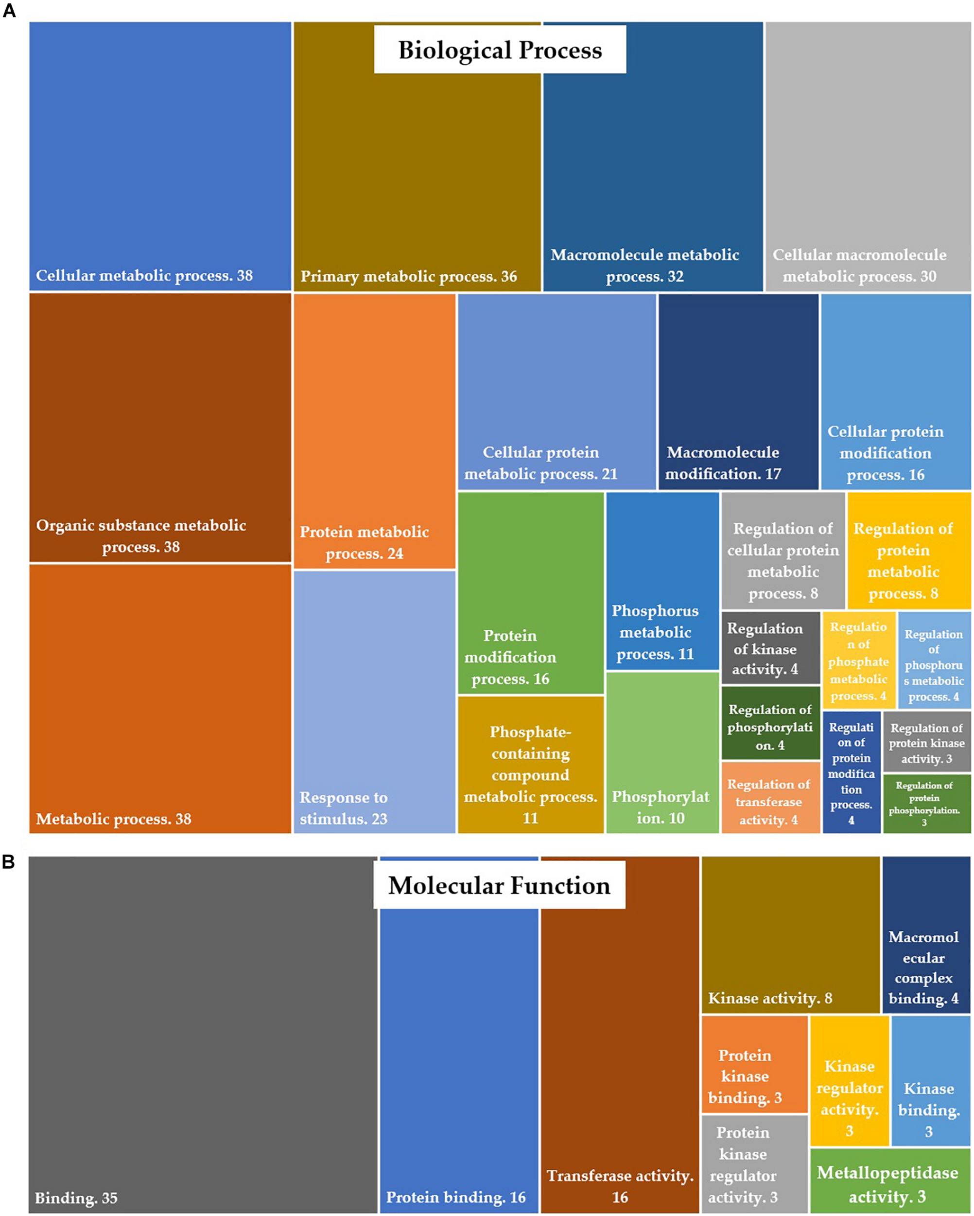 Of 679 differentially expressed transcripts, 570 transcripts were annotated in protein databases. Gene ontology (GO) enrichment analysis of differentially expressed genes (DEGs) was conducted to identify the functional categories of the annotated genes. These DEGs were assigned to GO-terms for biological processes and molecular functions (David annotation). The significantly (P-value <0.05) enriched biological processes (top 25 only) and molecular functions are presented in Figure 3. The complete list of GO categories of DEGs is listed in Supplementary Table 3. The major functional categories of biological processes were as follows: cellular metabolic process, organic substance metabolic process and metabolic process (n = 38 each); primary metabolic process (n = 36); macromolecule metabolic process (n = 32); cellular macromolecule metabolic process (n = 30); protein metabolic process (n = 24); response to stimulus (n = 23) and cellular protein metabolic process (n = 21) (Figure 3A). Among the various categories, binding (n = 35), protein binding and transferase activity (n = 16 each) were dominantly represented within the molecular function category. Other significantly represented categories include kinase activity (n = 8) and macromolecular complex binding (n = 4) (Figure 3B).