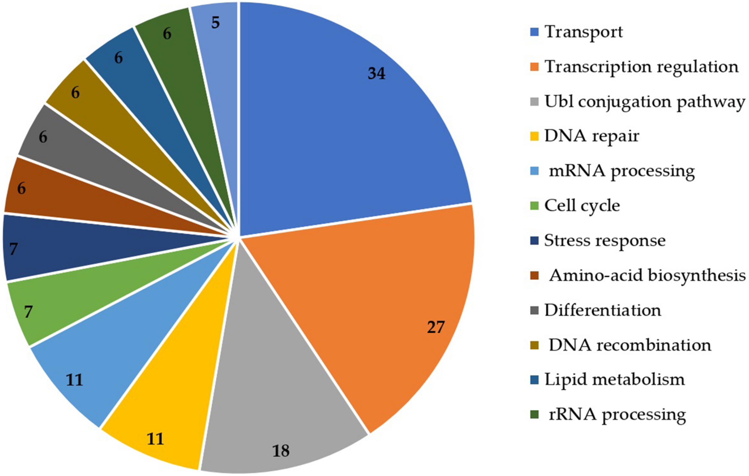 The functional annotation of DEGs was also retrieved from UniProt (Figure 4). Transport (n = 34), transcription regulation (n = 27), Ubl conjugation pathway (n = 18), DNA repair (n = 11) and mRNA processing (n = 11) were the most represented functions in the DEGs.