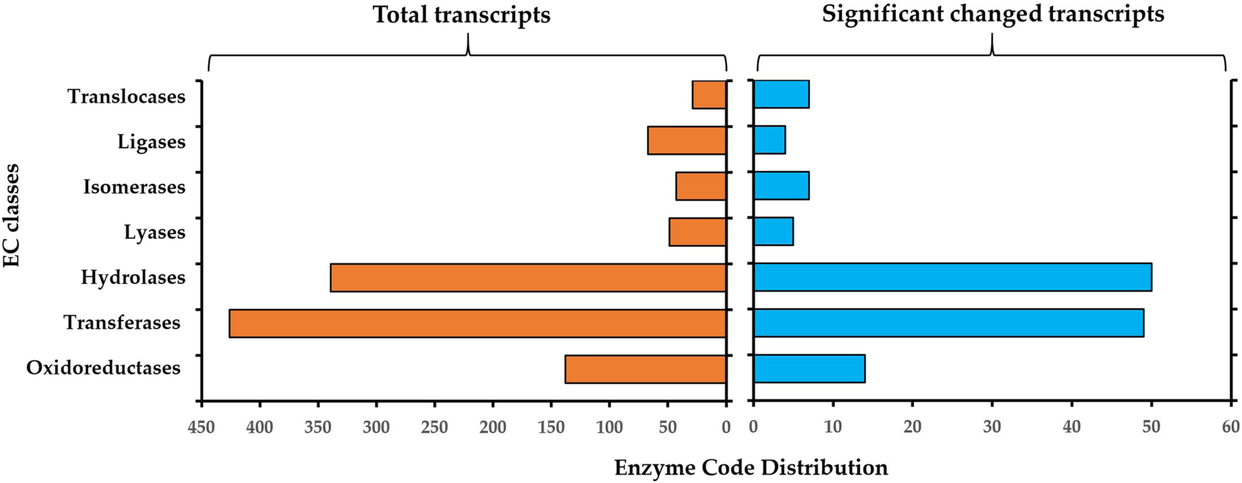 Enzyme classification (EC) codes for the total (left) and significantly changed transcript (right) upon S. Subterranea spore germination. Note that one transcript can be associated with more than one EC term.