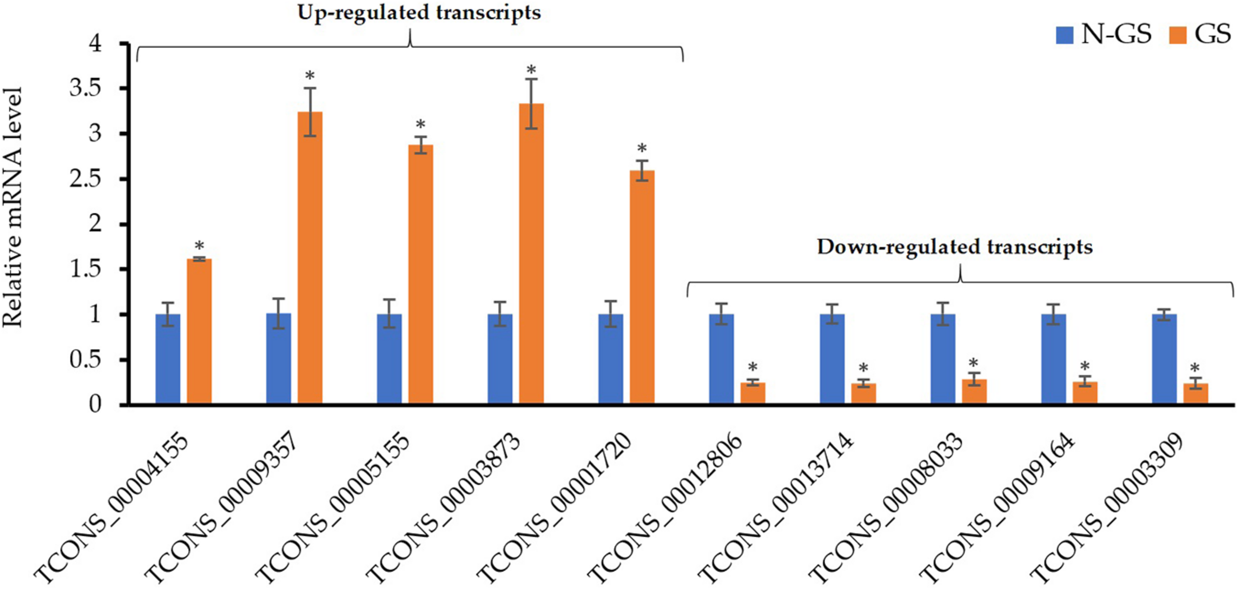 After obtaining the functional annotation of the identified transcripts from the gene and protein databases, we generated a list of selected DEGs with the possible role in the germination of resting spores in S. subterranea (Table 2). Among the upregulated group, the majority of genes were related to the initiation and regulation of transcription such as heat shock protein, transcription initiation factor and proteasome. The DNA repair genes such as DNA repair factor IIH helicase (Table 2 and Supplementary Table 2) were also found in the upregulated transcript. The multifunctional transcription factor, MADS−box transcription factor 6, was another upregulated gene. The expression levels of mannitol dehydrogenase, fatty acid synthase, trehalase and lipid droplet phospholipase which are involved in lipid and fatty acid metabolism were found to be downregulated upon germination. The mRNA expression of three important antioxidant genes was detected in the transcriptome of non-germinating and germinating spores of S. subterranea. While superoxide dismutase (SOD) was not found among the DEGs, the upregulation of glutathione S-transferase (GST) and the downregulation of catalase (CAT) was confirmed (Table 2 and Supplementary Table 2), highlighting the importance of these antioxidant enzymes in the protection of dormant and germinating spores from environmental stresses.