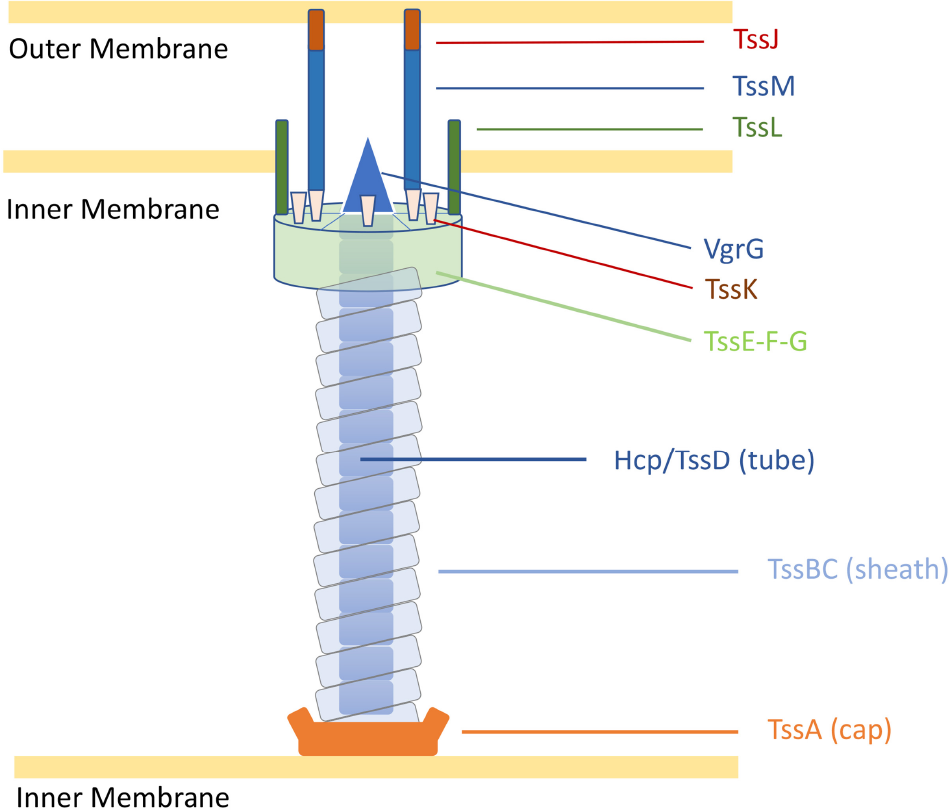 Representation of the C. jejuni T6SS in extended state [adapted from Cherrak et al. (2019)]. Proteins are labelled according to the nomenclature used for C. jejuni T6SS components. Tss, Type six secretion.