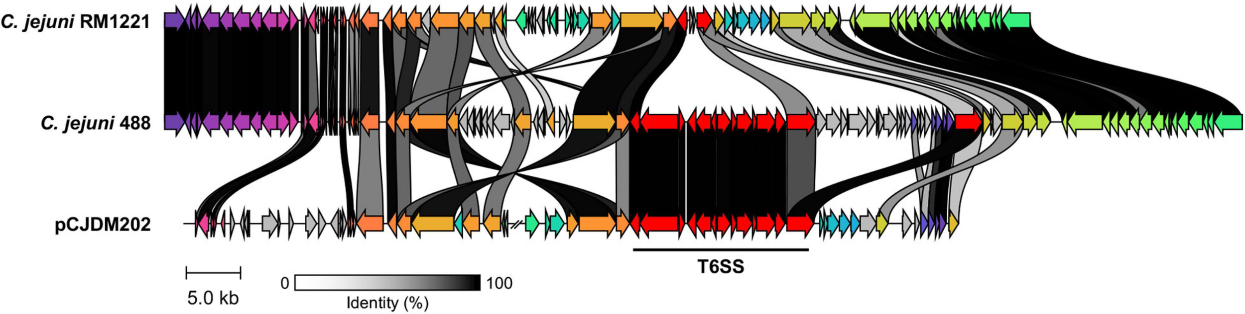 Artemis Comparison Tool and Clinker (Carver et al., 2005; Gilchrist and Chooi, 2021) were used to comparatively align the genome of the re-sequenced and assembled T6SS-positive C. jejuni 488 strain against strain RM1221 (CP000025) and annotated plasmid pCJDM202 (CP014743) (Fouts et al., 2005; Marasini and Fakhr, 2016). Amino acid identity was calculated with BLAST Global Alignment–Protein (Needleman-Wunsch Global Align), using default parameters (Altschul et al., 1990).