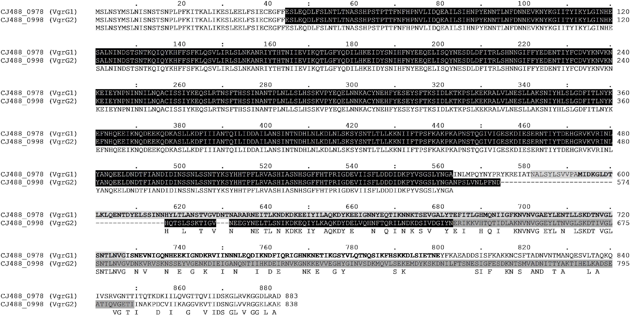 To assess sequence identity, amino acid sequences for proteins encoded by vgrG1 and vgrG2 in C. jejuni 488 strain were analysed by BLASTP (Altschul et al., 1990) against the NCBI reference protein database, excluding C. jejuni to prevent self-hits. Multiple sequence alignment of vgrG1 and vgrG2 was conducted using Clustal Omega (Madeira et al., 2019).