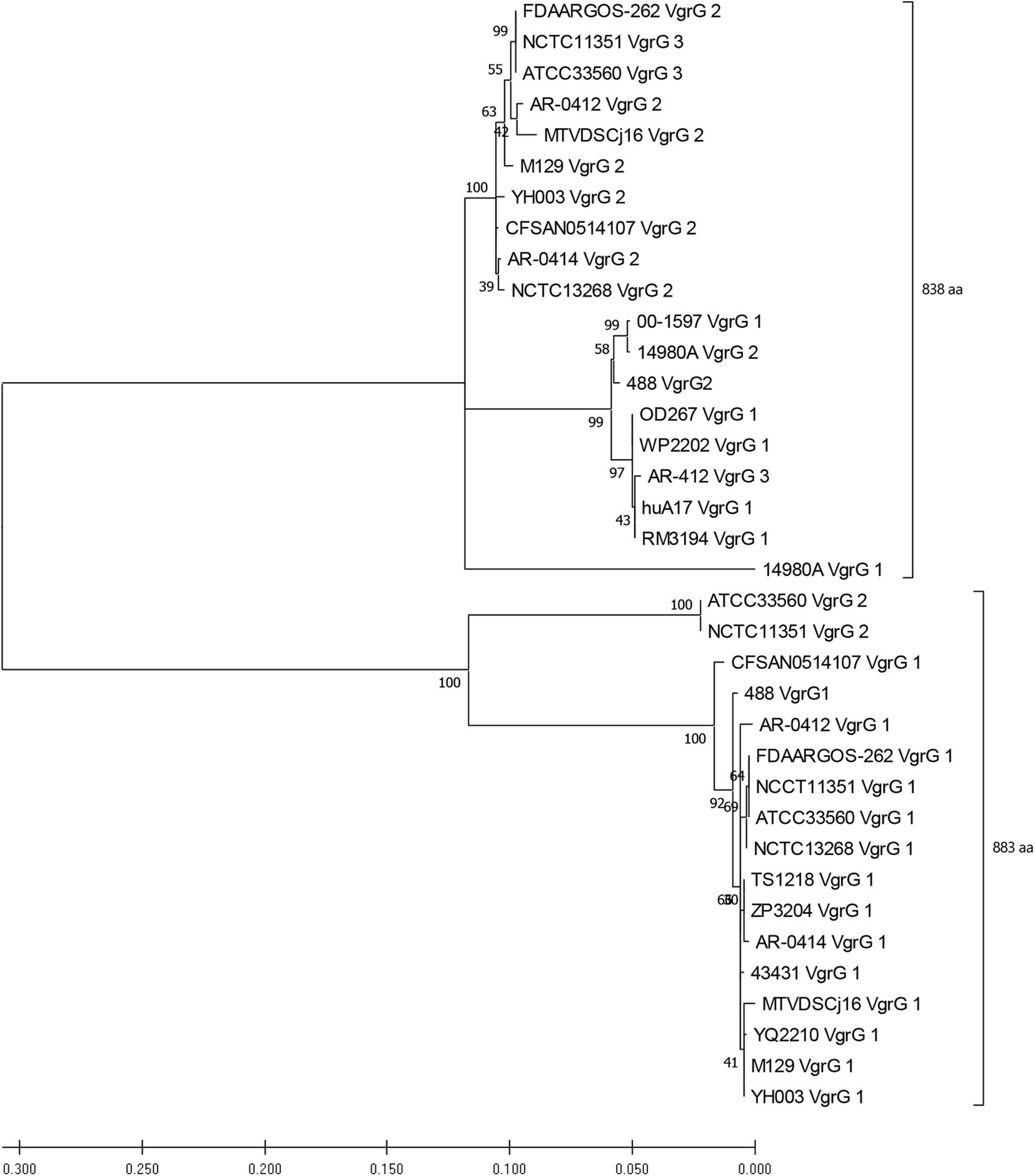 BLASTN (Altschul et al., 1990) was employed to identify vgrG genes amongst the C. jejuni genomes. The nucleotide sequence of the vgrG gene from the T6SS-positive 108 strain (JX436460) was aligned against a local nucleotide dataset created for the T6SS-positive C. jejuni genomes of assembly level “complete” or higher (Bleumink-Pluym et al., 2013). A cut-off similarity percentage was calculated according to Fridman et al. (2020). To be regarded as positive for a vgrG gene, a minimum similarity of 50% was required. Full length VgrG protein sequences were then obtained from T6SS-positive assembly level genomes “complete” or higher and aligned using MUSCLE (Edgar, 2004) with default parameters. Genomes CJ017CC464, CJ018CCUA, and ZS007 were removed from the analysis due to disrupted open reading frames (ORFs). A phylogenetic tree was constructed from the alignment file using the Maximum-Likelihood method, with JTT modelling, partial deletion (95%), and bootstrapping (n = 500) parameters, conducted in the Molecular Evolutionary Genetics Analysis X (MEGAX) v. 10.1.8 software package (Kumar et al., 2018). The analysis contained 36 amino acid sequences.