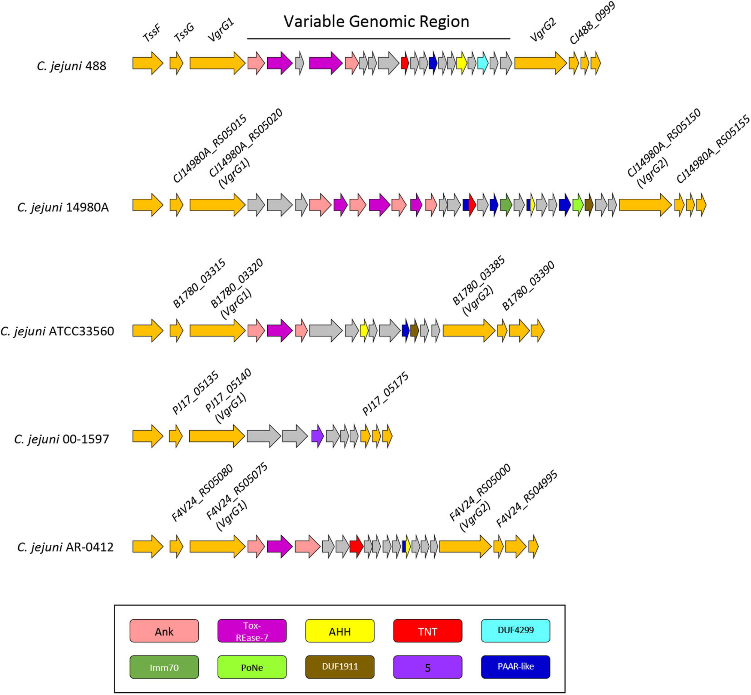 In C. jejuni, the T6SS biological functions have been associated with host colonisation, cell adhesion and invasion, survival in bile salts, contact-dependent lysis of erythrocytes, and contributing to oxidative stress (Lertpiriyapong et al., 2012; Bleumink-Pluym et al., 2013; Liaw et al., 2019). So far, Hcp has been suggested as a T6SS effector contributing to C. jejuni host cell adhesion and invasion (Lertpiriyapong et al., 2012; Bleumink-Pluym et al., 2013; Noreen et al., 2018); however, no evidence currently supports the direct contribution to these phenotypes by Hcp in isolation. Whilst few studies have indicated the prevalence of T6SS in C. jejuni (Harrison et al., 2014; Corcionivoschi et al., 2015; Ugarte-Ruiz et al., 2015), a larger comprehensive bioinformatic analysis of T6SS within C. jejuni and the identification of associated effectors are still needed. In this study, we investigated the prevalence and genomic organisation of the T6SS in 513 publicly available C. jejuni genomes through screening of the major T6SS components, previously characterised T6SS effectors, and the integrative element Campylobacter jejuni Integrated Element 3 (CJIE3). Using C. jejuni 488 strain as reference we discovered a novel pathogenicity island (PAI) variant of CJIE3, reclassifying the “T6SS-containing CJIE3” as Campylobacter jejuni Pathogenicity Island-1 (CJPI-1). We also observed that two distinct VgrG proteins are present in the PAI of C. jejuni 488 strain, with a number of other C. jejuni strains also possessing both VgrG proteins. Using bioinformatic analysis, we identified a number of putative T6SS effectors and predicted toxin-antitoxin (TA) modules carried by the CJPI-1 PAI.
