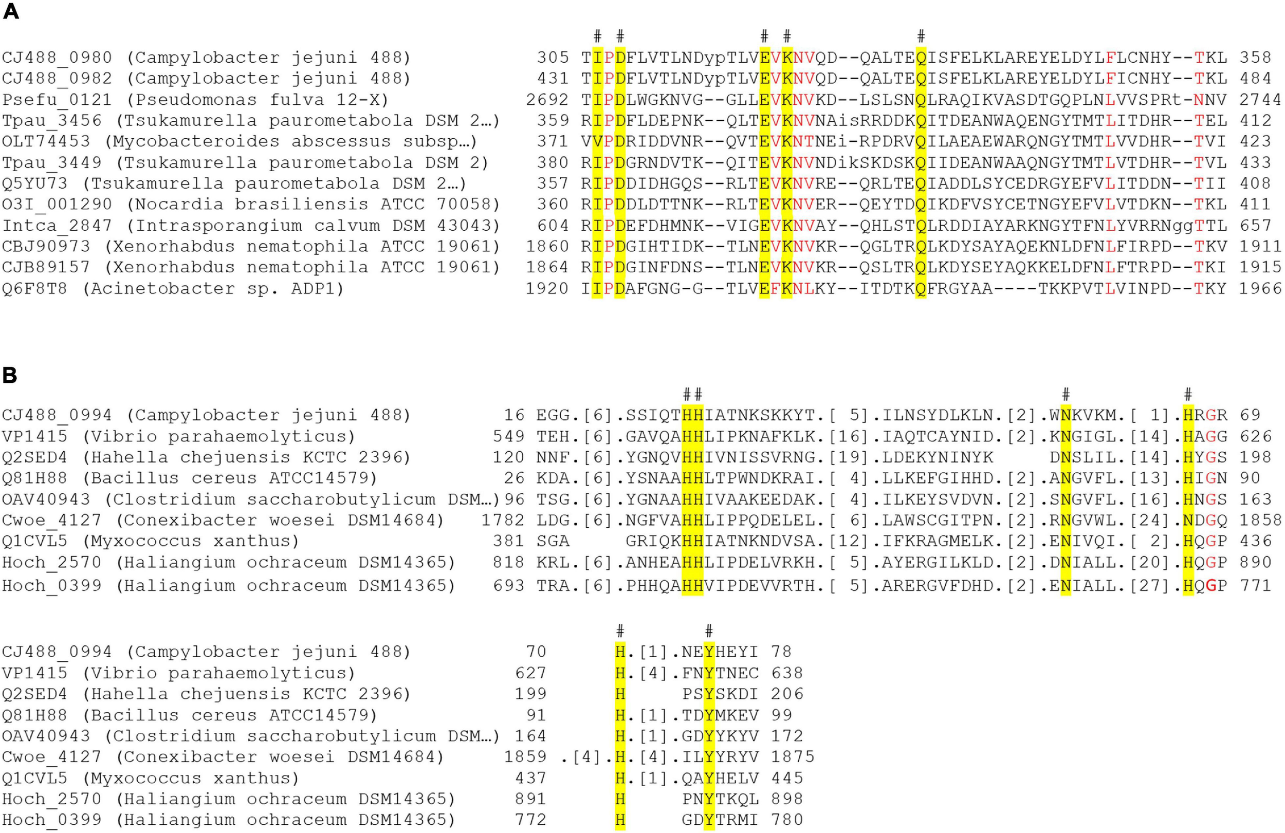 The amino acid sequences of the query proteins were searched against the NCBI-CDD (Marchler-Bauer et al., 2017), and the subsequent output alignments corresponding to identified domains were extracted and annotated to identify the conserved catalytic residues described (Zhang et al., 2012; Sun et al., 2015; Tak et al., 2019).