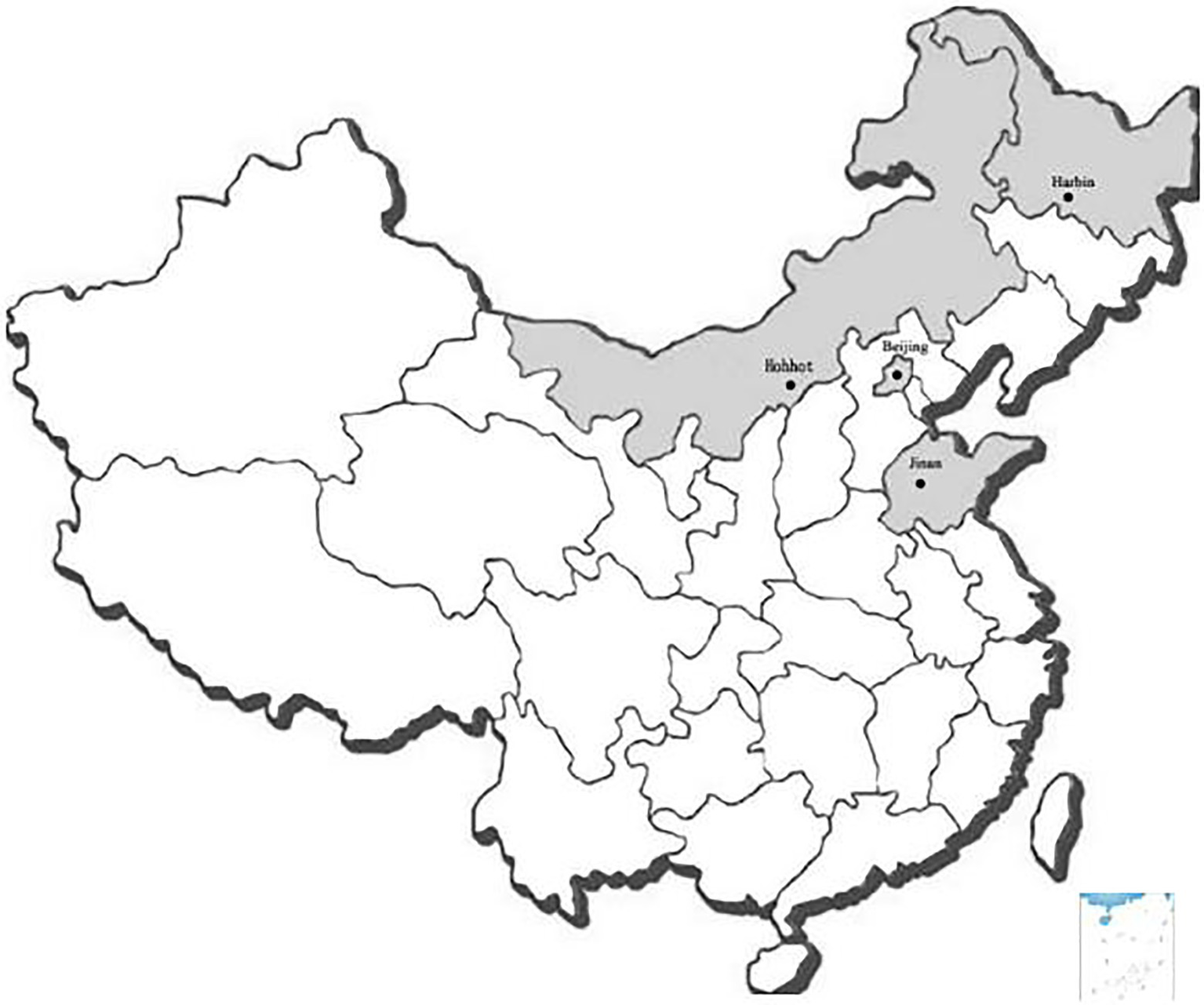 Figure 1. Map of sampling locations. In total, 195 samples were collected from Hohhot, Beijing, Harbin, and Jinan.