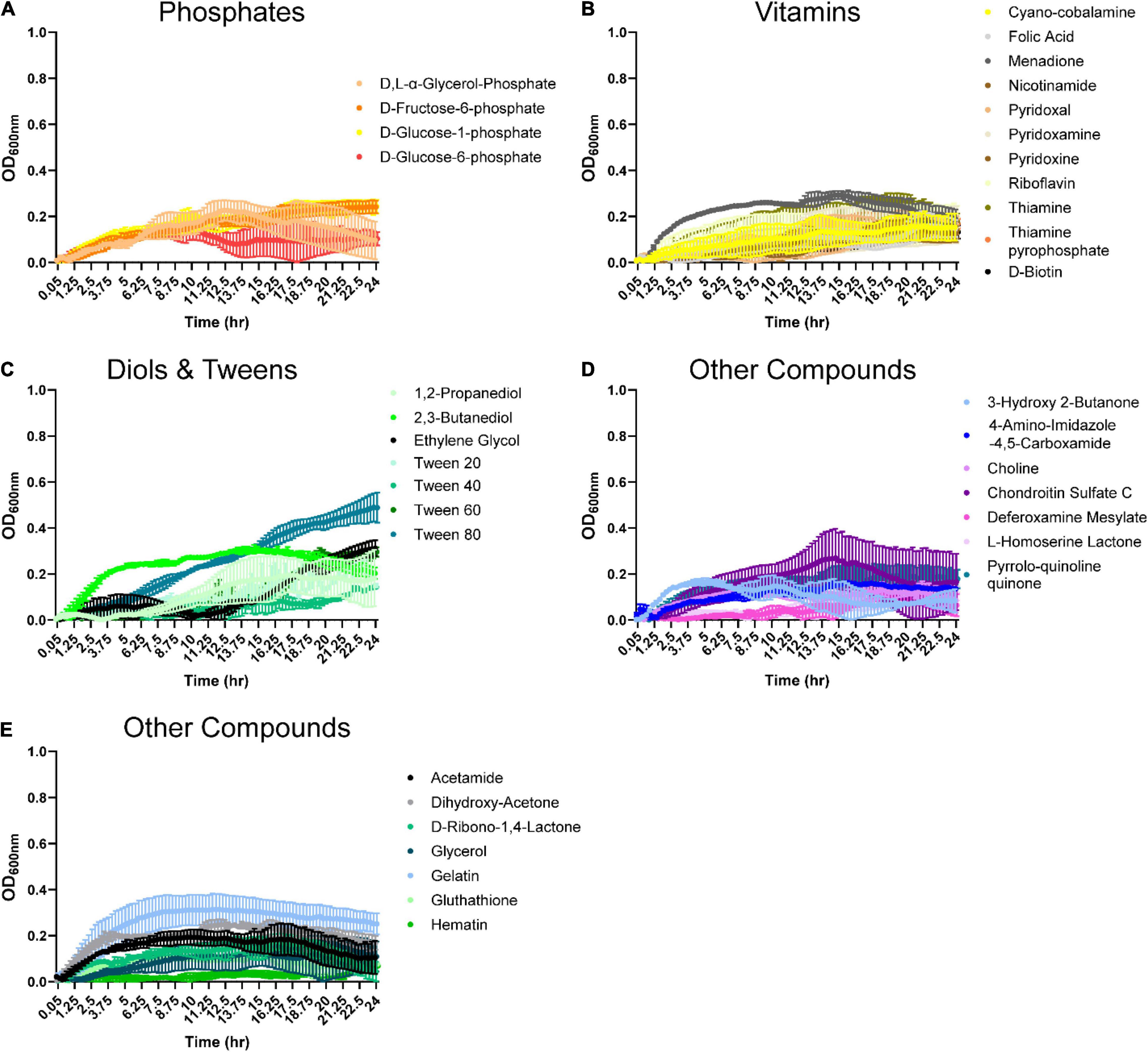 Figure 5. Bacteroides ovatus uses select substrates to support its growth. B. ovatus ATCC 8384 was grown anaerobically at 37°C in Biolog plates with a chemically-defined minimal media (CDMM) preparation that lacked glucose. Growth was monitored over 24 h by plate reader in plates containing (A) phosphates, (B) vitamins, (C) diols and tweens, and (D,E) other compounds. All data are presented as mean ± stdev.