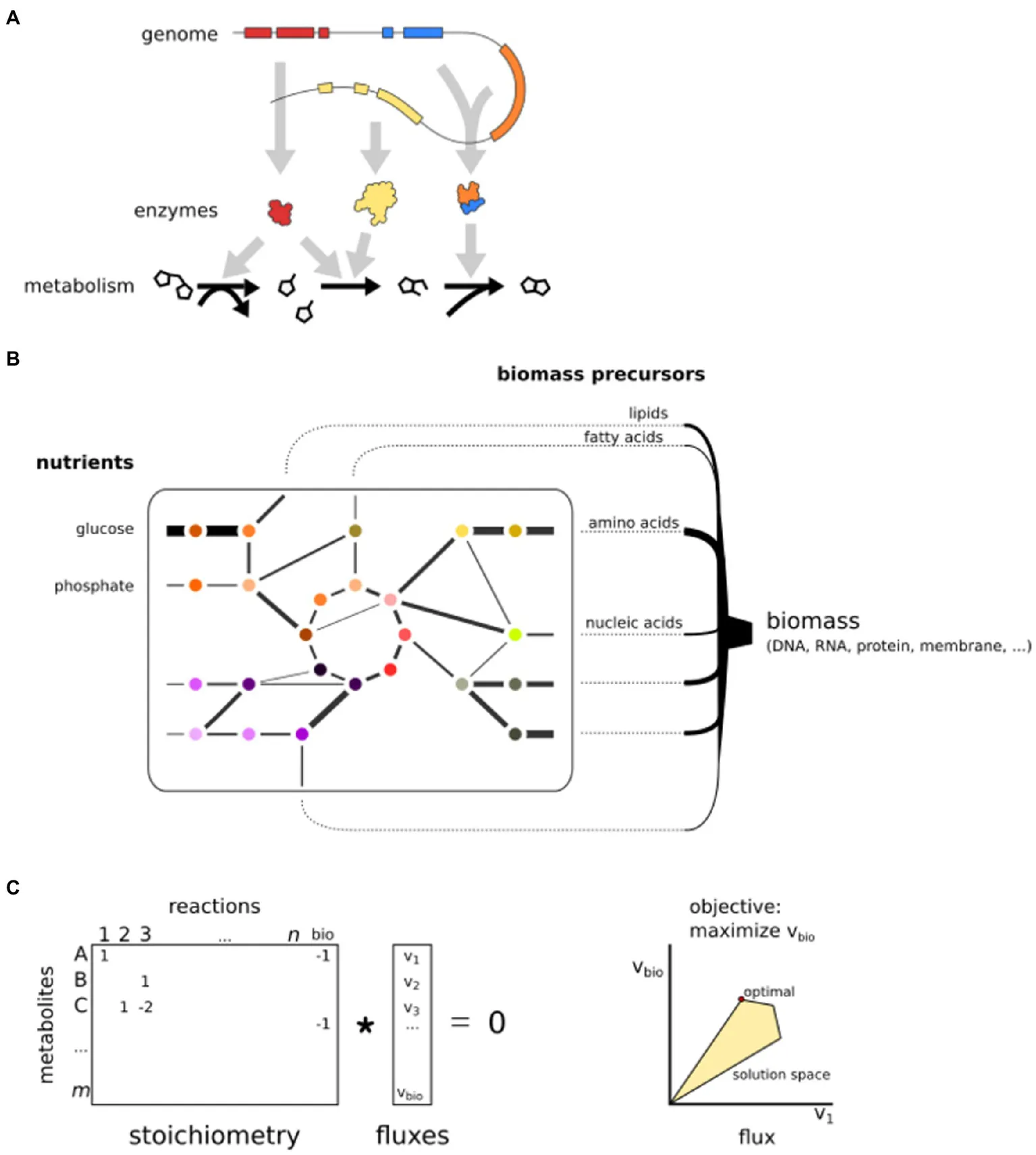 Basic principles of GEMs. (A) GEMs are reconstructed from a genome sequence and connect enzymes to reactions. (B) A GEM is a network that simulates fluxes from nutrient uptake to the production of biomass precursors. (C) The mathematical representation of a GEM. Reactions are stored in a stoichiometric matrix that is multiplied by a vector of fluxes. The solution space is limited by constraints. Here, only two fluxes are shown, but the optimization is in n dimensions.