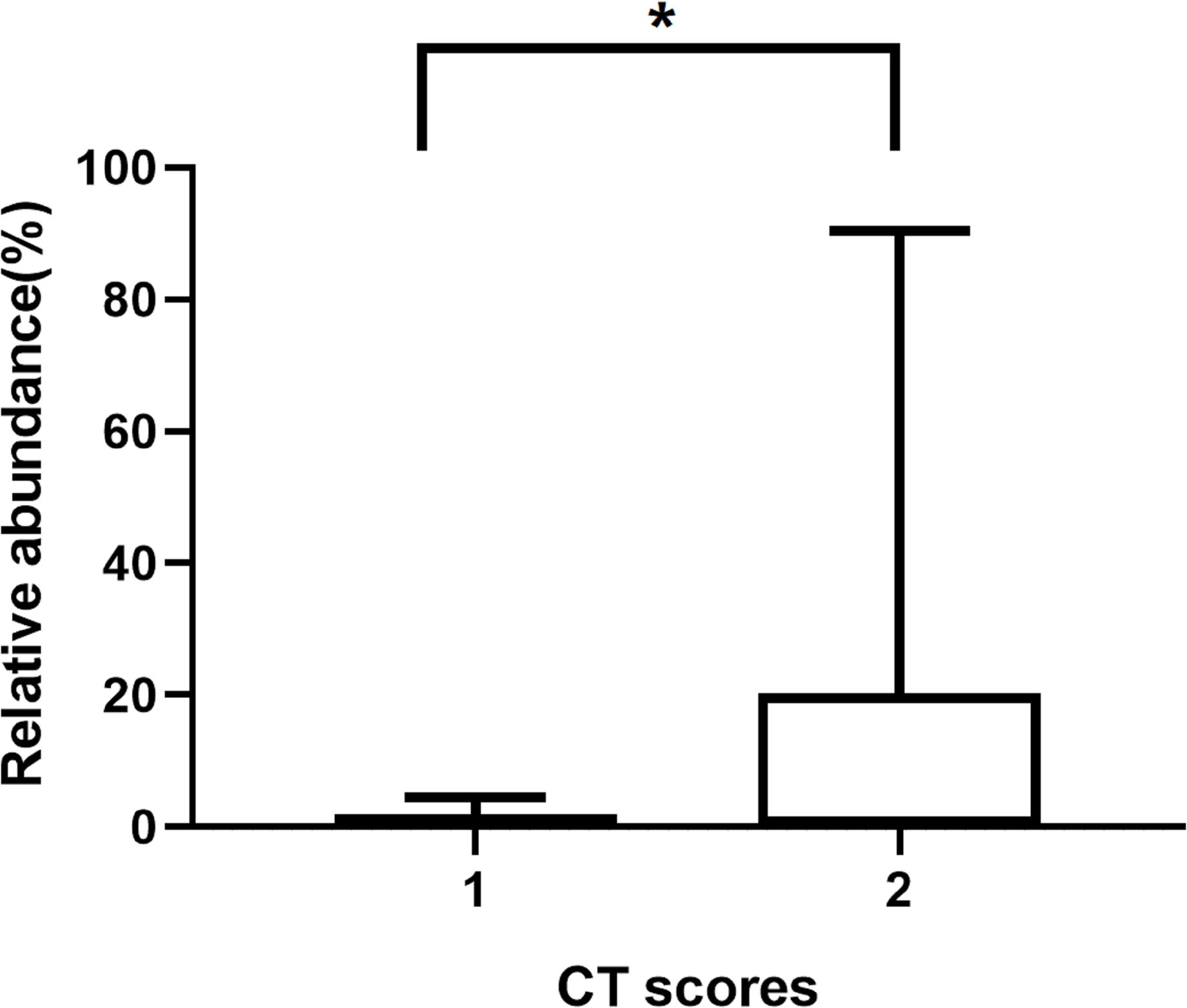 Significant differences in the relative abundance of microbial taxa (i.e., the proportions of each microbe) between patient groups (categorized by CT score) were determined using t-tests. Fisher’s exact test were used to evaluate independent binomial variables (SPSS version 20). The p-value of ≤0.05 was considered statistically significant.
