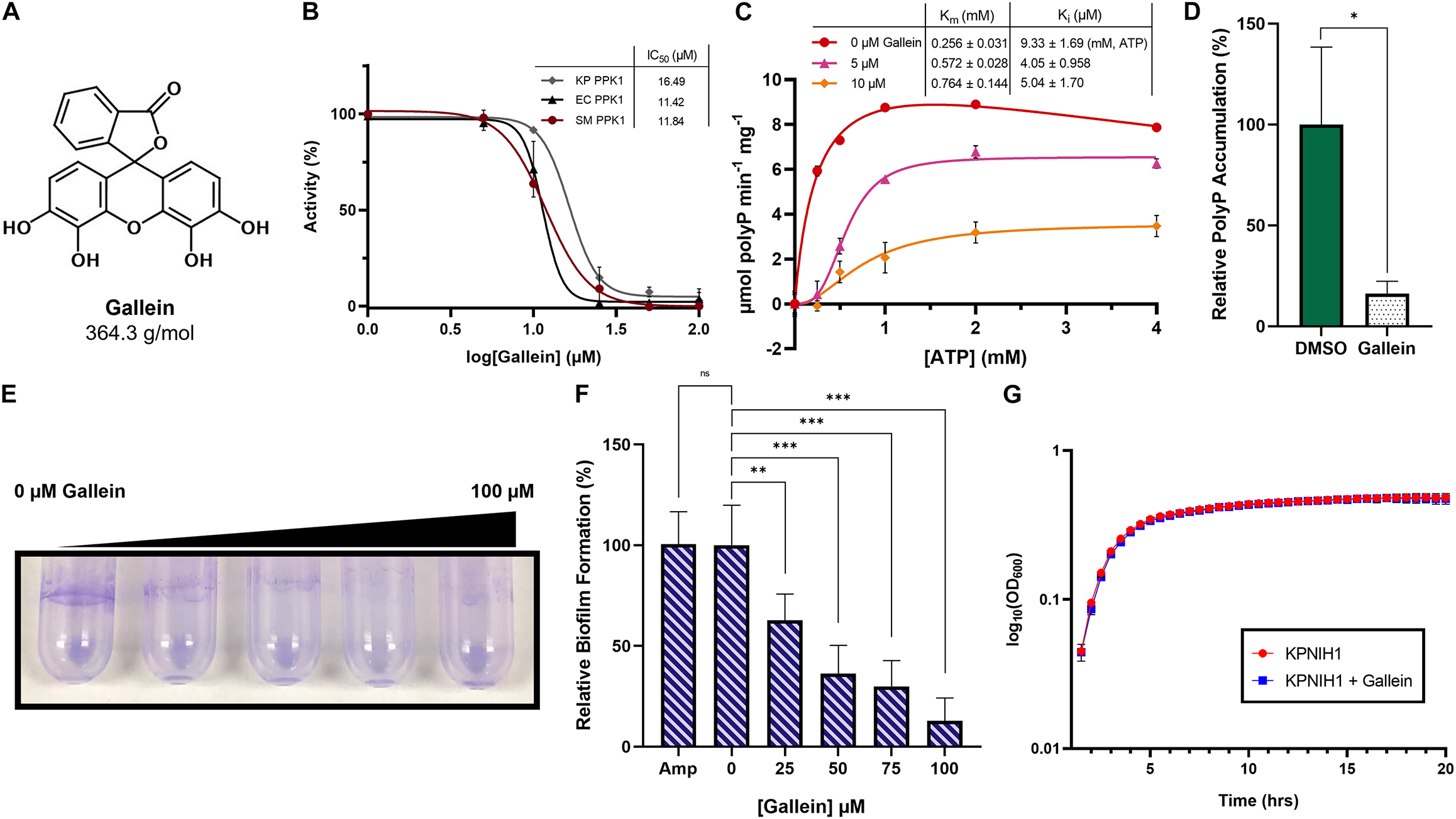 Gallein inhibits Enterobacteriaceae PPK1s in vitro, and reduces intracellular polyP accumulation, biofilm formation in K. pneumoniae. (A) Chemical structure of gallein. (B) Dose-dependent inhibition of polyP synthesis by purified PPK1 enzymes from Klebsiella pneumoniae (KP), Escherichia coli (EC), and Serratia marcescens (SM). (C) Enzyme kinetic analysis of K. pneumoniae PPK1. Units are reported in specific activity (μmol per min per mg PPK). Uninhibited curve fit using substrate inhibition model (Vo = Vmax*[S]/(Km + [S]*(1 + [S]/Ki)) where S is substrate), while inhibited curves fit using sigmoidal model (Vo = Vmax*[S]^h/(Km^ h + [S]^h), where S is substrate, and h is the Hill coefficient). (D) Effect of 100 μM gallein treatment on starvation-induced intracellular polyP accumulation in K. pneumoniae. (E) Representative image of gallein treatment on K. pneumoniae biofilm formation. Image is representative of n = 3 assays. (F) Dose-dependent effects of gallein and 100 μg/mL ampicillin on K. pneumoniae biofilm formation. (G) Growth kinetics in lysogeny broth of K. pneumoniae KPNIH1 in the presence or absence of gallein. Symbols are as follows: ns, p > 0.05; p < 0.05; ∗∗p < 0.01; ∗∗∗p < 0.001. For (D), two-way Unpaired t-test, n = 3; for (F), one-way ANOVA, Tukey’s multiple comparison test, n = 6, Amp n = 3.