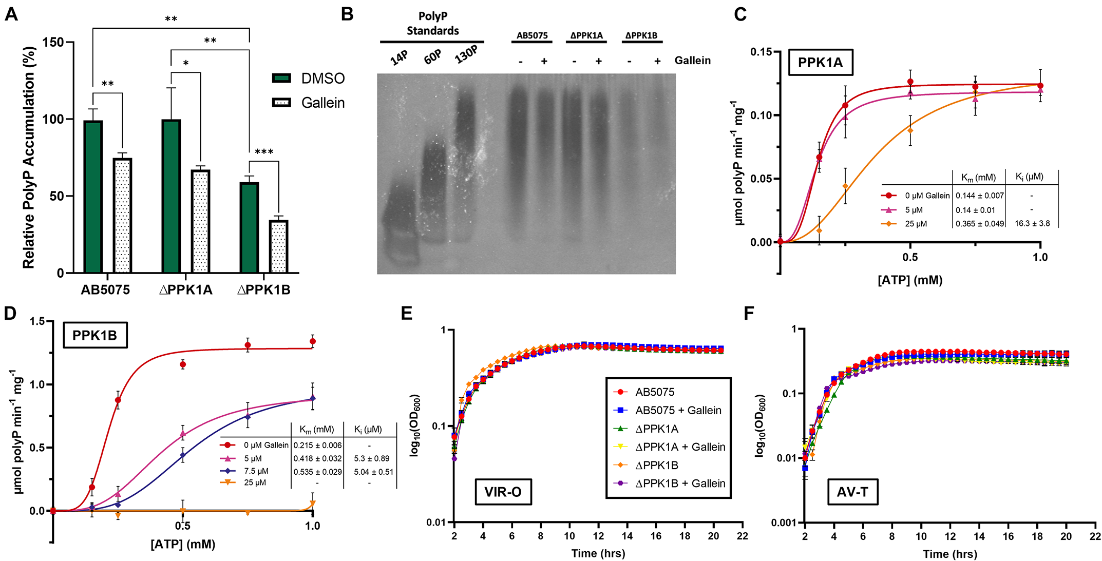 Gallein inhibits A. baumannii PPK1s in vitro and intracellularly but does not attenuate growth kinetics (A) Effect of gallein treatment on starvation-induced intracellular polyP accumulation (B) Bacterial polyP extracts treated with 100 μM gallein or DMSO vehicle analyzed via electrophoresis on Tris-borate-EDTA (TBE)-urea gel following negative DAPI staining. Image is representative of n = 3 gels. (C,D) Enzyme kinetic analysis of PPK1A (C) and PPK1B (D). Units are reported in specific activity (μmol per min per mg PPK). Curves fit using sigmoidal model (Vo = Vmax*[S]^h/(Km^ h + [S]^h), where S is substrate, and h is the Hill coefficient). (E,F) Growth kinetics in lysogeny broth of VIR-O (E) and AV-T (F) phase-variants in the presence or absence of gallein. Symbols are as follows: p > 0.05; p < 0.05; ∗∗p < 0.01; ∗∗∗p < 0.001 (two-way ANOVA, Tukey’s multiple-comparison test, n = 3). All data points are the average from triplicates; error bars are ± SD.