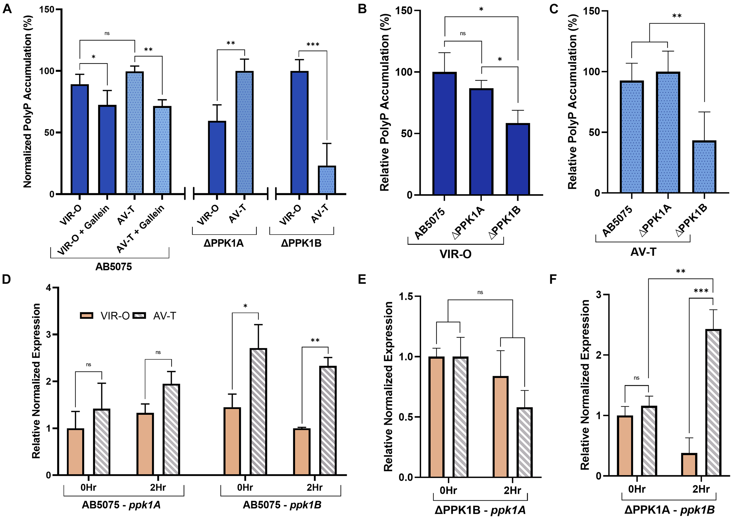 A. baumannii polyP accumulation and PPK1 transcription display phase-variant specific regulation. (A) Relative phase-variant specific starvation-induced polyP accumulation of all strains. Parent and individual PPK1 knockout strains polyP levels are normalized with respect to the higher signal phase-variant. (B,C) Starvation-induced polyP accumulation of VIR-O (B) and AV-T (C) phase-variants between parent and PPK1 knockout strains. Data points are the average from triplicates or more; error bars are ± SD. (D) Phase-variant specific relative normalized expression of ppk1A and ppk1B in A. baumannii parent strain following 2 h phosphate-starvation. All AV-T as well as VIR-O ppk1 transcription is not significantly different. (E,F) Phase-variant specific relative normalized expression of ppk1A from PPK1B and ppk1B from PPK1A respectively. (D–F) Are normalized with respect to clpX. Data points are the averages from 3 independent RNA isolations, error bars are ± SEM. Symbols are as follows: ns, p > 0.05; p < 0.05; ∗∗p < 0.01; ∗∗∗p < 0.001. For (A), two-way ANOVA, conTukey’s multiple-comparison test, n = 3, VIR-O/VIR-O + Gallein n = 5; (B,C), two-way Unpaired t-test, n = 3; (D–F), two-way Unpaired t-test.
