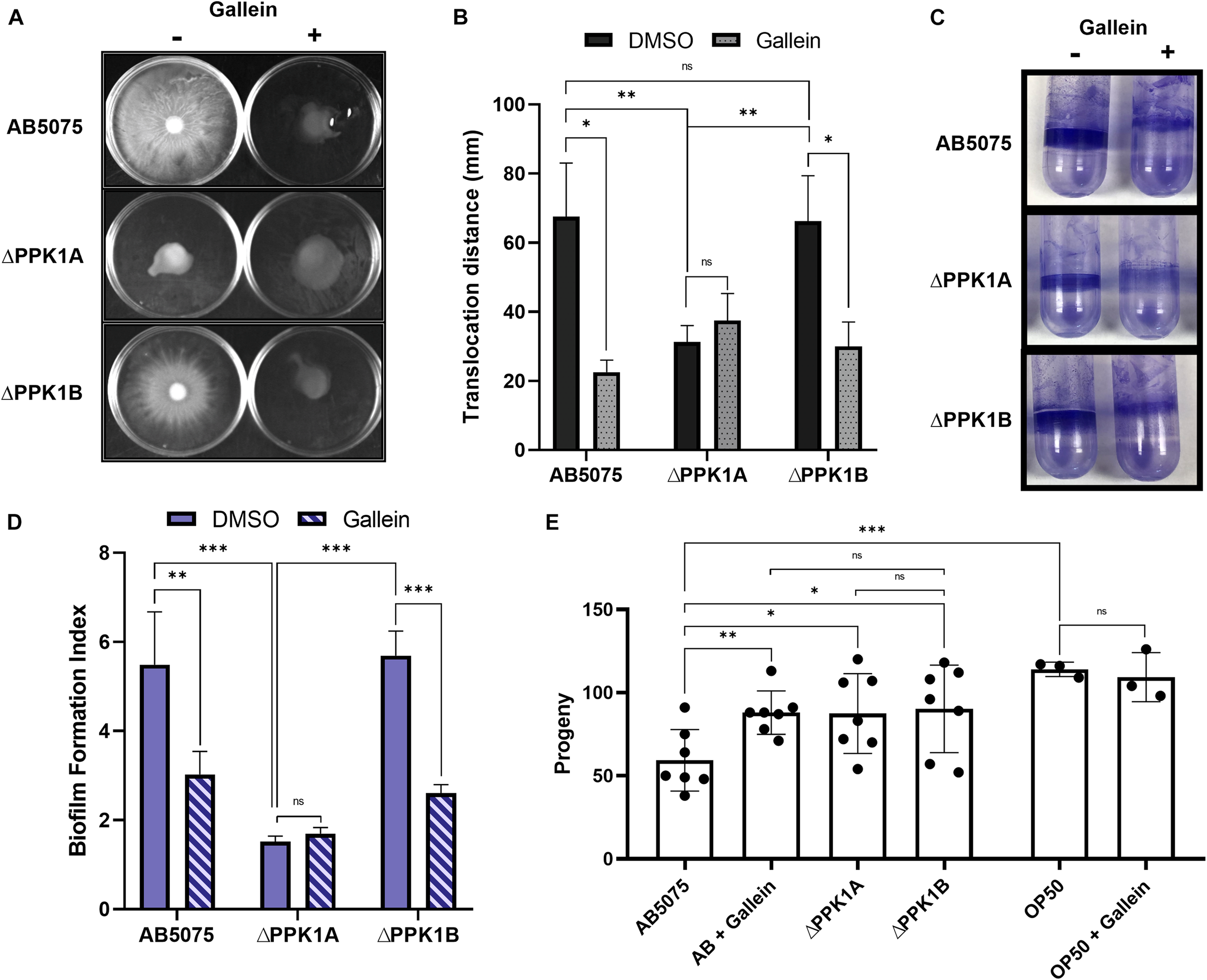 Gallein phenocopies PPK1 knockouts to attenuate A. baumannii virulence. (A) Representative image of 100 μM gallein treatment and PPK1 knockout on A. baumannii surface-associated motility. Image is representative of n = 4 assays. (B) Quantification of gallein treatment and PPK1 knockout on surface-associated motility. All gallein samples and ΔPPK1A DMSO are not significantly different. (C) Representative image of 100 μM gallein treatment and PPK1 knockout on A. baumannii biofilm formation. Image is representative of n = 3 assays. (D) Quantification of gallein treatment and PPK1 knockout on biofilm formation. (E) Progeny count of C. elegans following feeding with A. baumannii strains (n = 7) or OP50 (n = 3). Symbols are as follows: ns, p > 0.05; p < 0.05; ∗∗p < 0.01; ∗∗∗p < 0.001. For (B,D) two-way ANOVA, Tukey’s multiple-comparison test; (E) two-way Unpaired Welch’s t-test. Data points are the average of triplicates or more; error bars are ± SD.