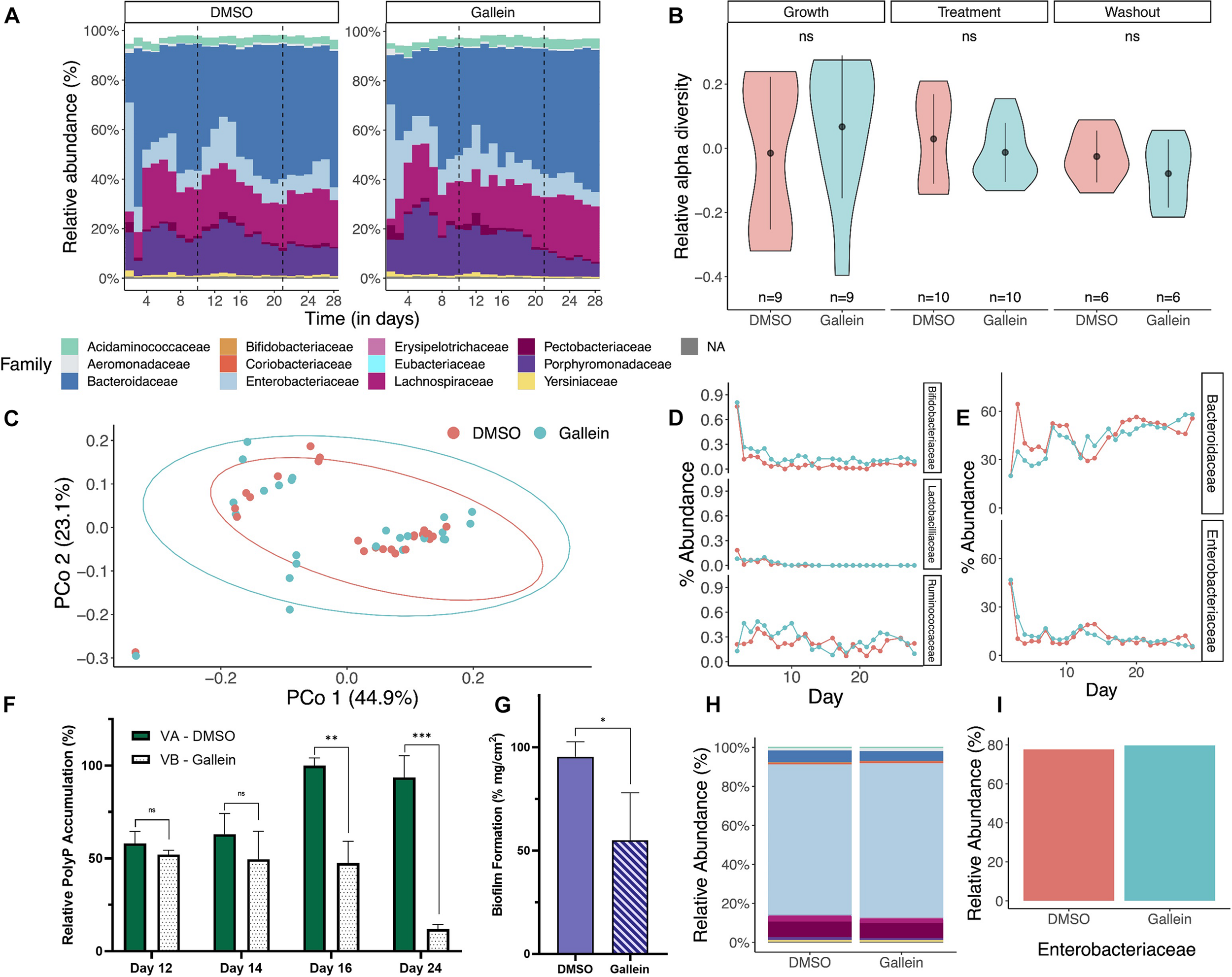 Next, we sought to assess the non-disruptive properties of gallein which remain a hallmark of anti-virulence therapeutics. Chemostat bioreactors are used to culture complex microbial communities that resemble those within the gastrointestinal microbiota (GIM). These systems employ a continuous culture model and provide valuable insight into compositional changes in microbial communities over time and in response to perturbations (Guzman-Rodriguez et al., 2018). To assess the effects of gallein on the GIM, a twin-vessel chemostat system was inoculated with 33 different bacterial strains, representative of a “healthy” GIM community. The chemostats showed similar changes in microbial distributions and compositions at the family taxonomic level across time (Figure 5A). We found no significant difference in relative alpha diversity when comparing treatment conditions within a given phase or when comparing phases within a given treatment (Figure 5B). There is no significant difference in beta diversity, as can be seen in PCoA clustering when comparing treatment groups (Figure 5C) and validated using Jaccard’s distance. We observed that time had a significant effect on alpha and beta diversity (Supplementary Figure 8), but these changes were consistent in both treatment and control. We did not observe differences in the percent abundance of selected families of Gram positive (Bifidobacteriaceae, Lactobacilliaceae, and Ruminococcaceae) organisms and Gram negative (Bacteroidaceae and Enterobacteriaceae) organisms (Figures 5D,E). The addition of gallein was found to significantly reduce total community polyP abundance during the treatment time course, as well as following compound washout (Figure 5F). Interestingly, we also observed a significant reduction in adhered exopolymer within the waste outflow tubing of the chemostat vessel which had received gallein treatment, compared to DMSO (Figure 5G). When evaluating the community composition of the adhered biological matrices, we did not notice any significant differences between the vessel that was exposed to gallein compared to the vessel exposed to DMSO (Figure 5H). Furthermore, when assessing percent abundance of bacteria within the family Enterobacteriaceae specifically, we did not notice a difference between the two vessels (77.7 and 79.7%) (Figure 5I).