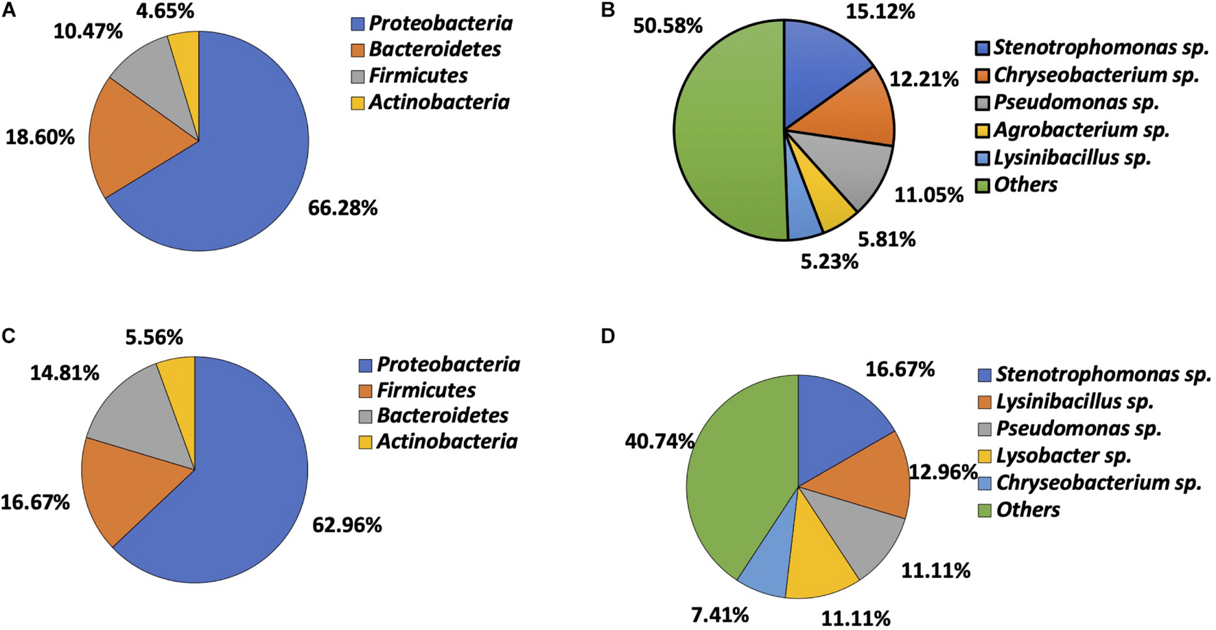 A total of 226 bacteria were isolated, including 54 from soil (13 Gram-positive and 41 Gram-negative) and 172 from vegetables (33 Gram-positive and 139 Gram-negative). Gram-negative bacteria (n = 180) were predominant. Bacteria from vegetables belonged to four phyla, including Proteobacteria (n = 114, 66.28%), Bacteroidetes (n = 32, 18.60%), Firmicutes (n = 18, 10.47%), and Actinobacteria (n = 8, 4.65%) (Figure 1A). Twenty-nine genera were identified, Stenotrophomonas (n = 26, 15.12%), Chryseobacterium (n = 21, 12.21%), Pseudomonas (n = 19, 11.05%), Agrobacterium (n = 10, 5.81%), and Lysinibacillus (n = 9, 5.23%) being most prevalent. The remaining genera combined accounted for 50.58% (n = 87) of total isolates (Figure 1B). Isolates recovered from soil also belonged to the same four phyla, with Proteobacteria being predominant (n = 34, 62.96%), followed by Firmicutes (n = 9, 16.67%), Bacteroidetes (n = 8, 14.81%), and Actinobacteria (n = 3, 5.56%) (Figure 1C). They consisted of 21 genera. Stenotrophomonas (n = 9, 16.67%), Lysinibacillus (n = 7, 12.96%), Pseudomonas (n = 6, 11.11%), Lysobacter (n = 6, 11.11%), and Chryseobacterium (n = 4, 7.41%) were most common. The remaining genera combined made up 40.74% of the isolates (n = 22) (Figure 1D).