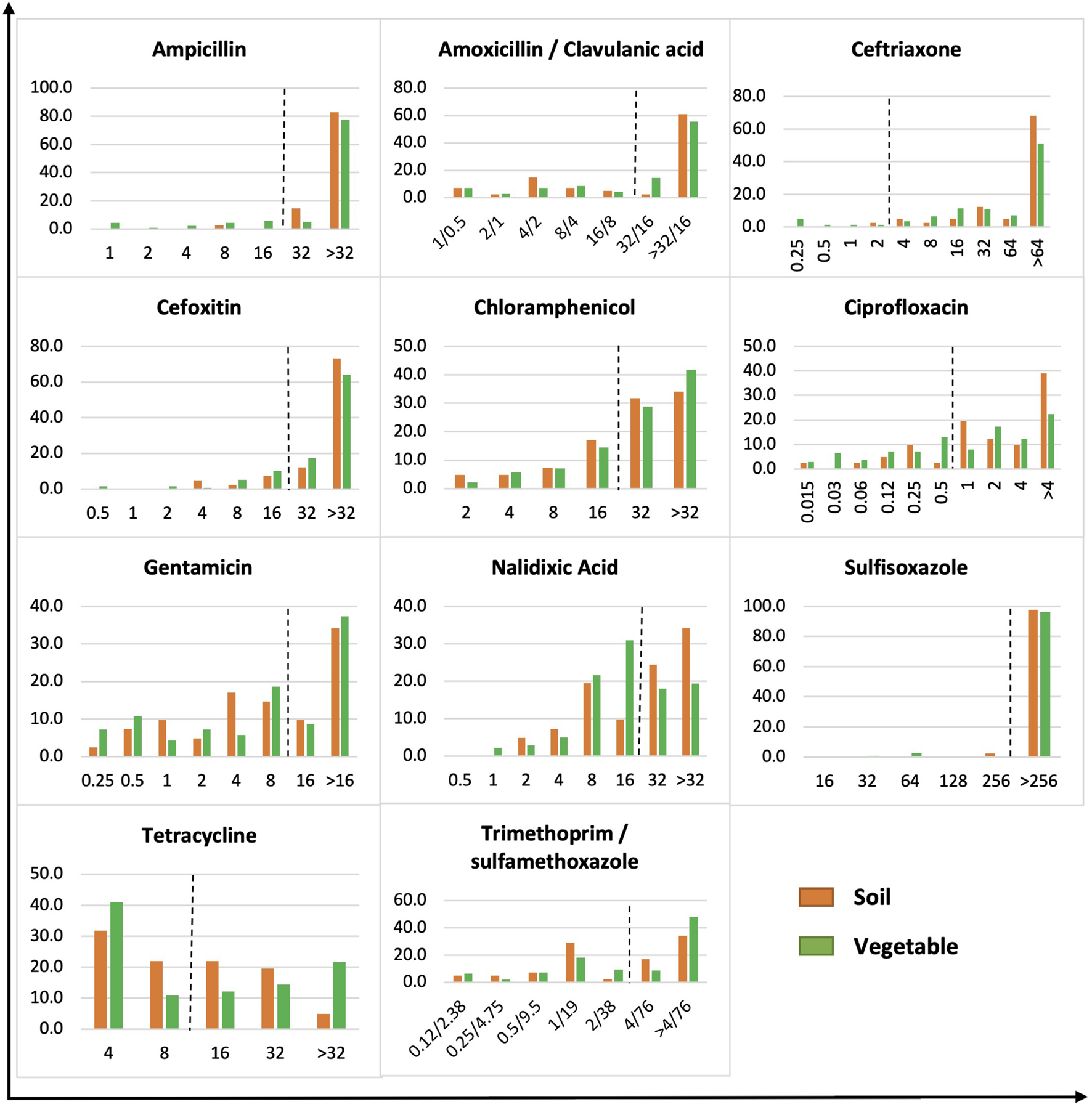 Figure 2. MIC distribution of gram-negative bacteria from soil and vegetable origin. X-axis is MIC in μg/ml. Y-axis is % of soil or vegetable isolates. The dot line on each figure stands for the breakpoint of E. coli against the specific antibiotic.
