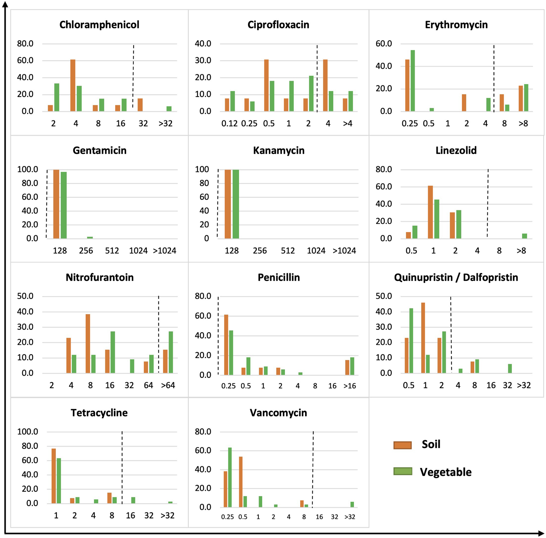 Figure 3. MIC distribution of gram-positive bacteria from soil and vegetable origin. X-axis is MIC in μg/ml. Y-axis is % of isolates of soil or vegetable isolates. The dot line on each figure stands for the breakpoint of S. aureus against the specific antibiotic.