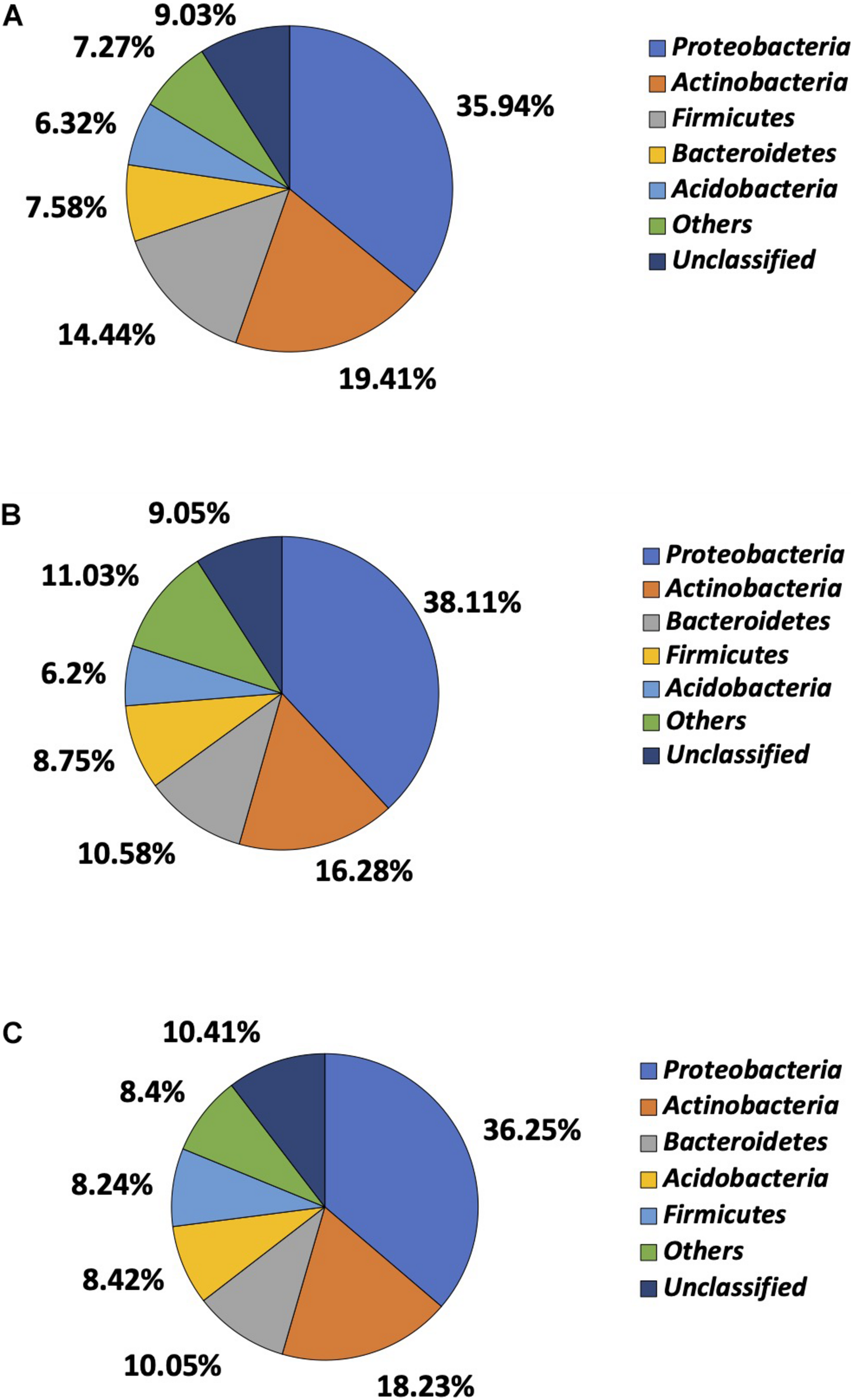 Figure 4. Microbial composition determined at phylum level by 16S rRNA sequencing. (A) Phylum distribution of soil bacteria in Garden E. (B) Phylum distribution of soil bacteria in Garden G. (C) Phylum distribution of soil bacteria in Garden O.