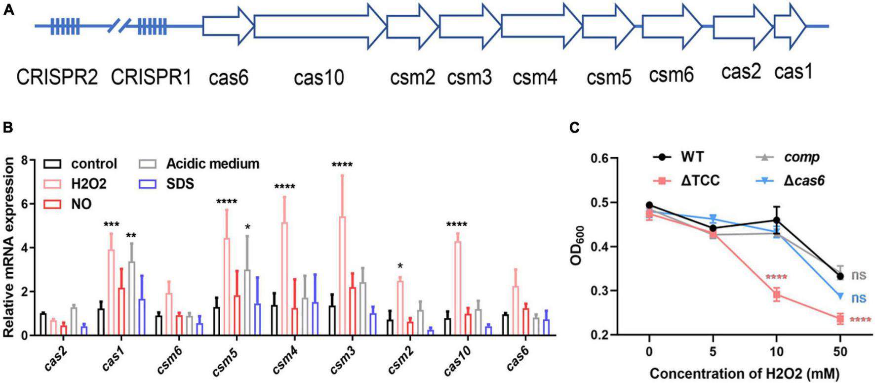Figure 1. Inactivation of type III-A CRISPR-Cas system decreased bacterial survivability under oxidative stress. (A) Schematic of the Mycobacterium bovis BCG type III-A CRISPR-Cas operon. The type III-A CRISPR-Cas loci comprise csm2-6, cas10, cas6, cas1, cas2, and two CRISPR locus. (B) Fold changes in mRNA level of nine cas genes during different stresses. BCG was grown in 7H9 medium containing OADC and Tween 80 to mid-log phase. These strains were treated with different stresses, including 5mM NO, acidic medium (pH4.5), 1% SDS, 5mM H2O2. The expression of cas genes was analyzed by real time PCR (n = 3 biological replicates per group, data are shown as the mean ± SEM, two-way ANOVA with Tukey’s multiple comparison test, compared with control group; *p < 0.05, **p < 0.01, ****p < 0.0001). (C) Differential susceptibility of WT BCG, ΔTCC, comp, or Δcas6 strains to H2O2 compared to control was determined by OD600 measurements. M. bovis BCG were grown in 7H9 medium containing OADC and Tween 80 to mid-log phase. The cultures were treated with different amounts of H2O2. OD600 were recorded (n = 3 biological replicates per group, data are shown as the mean ± SEM, two-way ANOVA with Tukey’s multiple comparison test, compared with WT group; ns, not significant, ***p < 0.001, ****p < 0.0001).