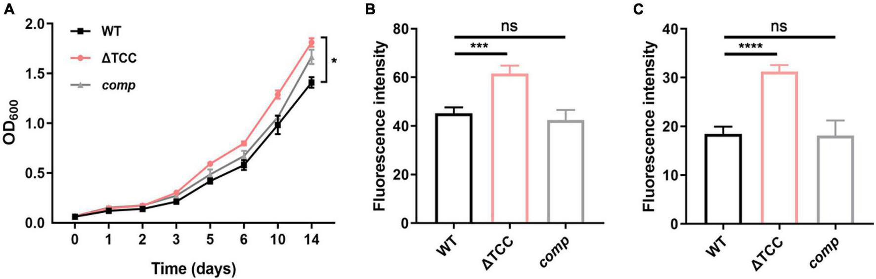 Figure 2. The effect of TCC deletion on mycobacterial cell wall permeability. (A) WT, TCC deletion mutant, comp strains were grown to mid-log phase, washed. Bacteria were diluted to an initial OD600 of 0.05 and the OD600 was monitored at the designated time points. Cell growth was monitored by OD600 measurements (n = 3 biological replicates per group, data are shown as the mean ± SEM, two-way ANOVA with Tukey’s multiple comparison test, compared with WT group; *p < 0.05). (B,C) WT, TCC deletion mutant, comp strains were grown to mid-log phase, washed, and stained with (B) Nile red or (C) ethidium bromide, and fluorescence was measured (n = 3 biological replicates per group, data are shown as the mean ± SEM, one-way ANOVA with Dunnett’s multiple comparison test, compared with WT group; ns, not significant; ***p < 0.001, ****p < 0.0001).