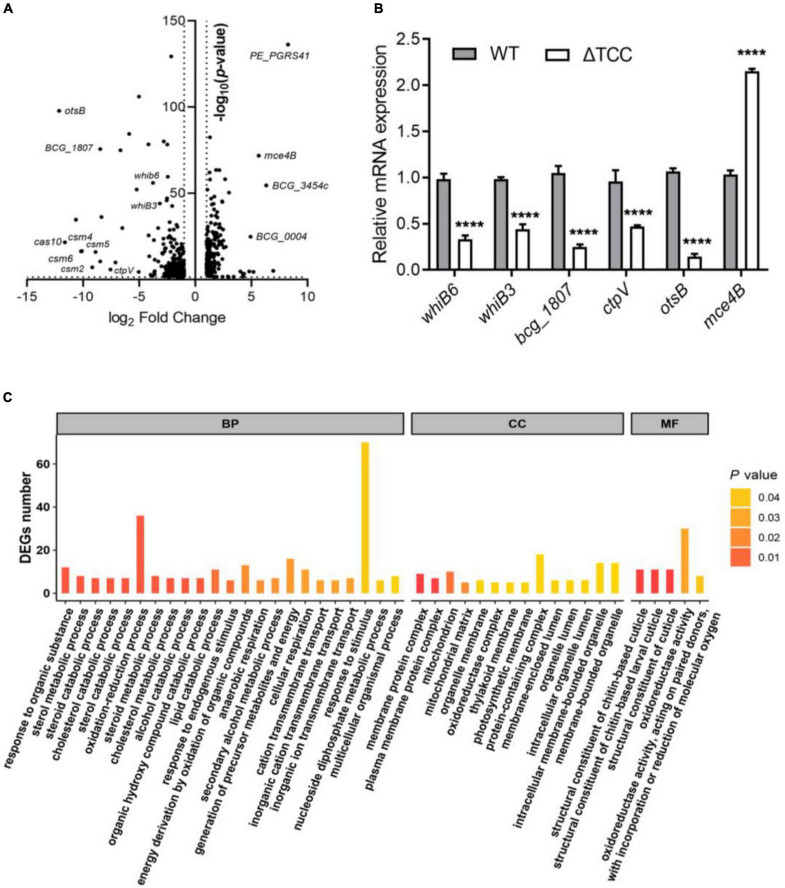 Figure 3. Gene-expression differences between WT and ΔTCC. (A) The volcanic diagram of gene expression difference between WT and ΔTCC strains determined by RNA-seq. The significantly upregulated and downregulated genes [p ≤ 0.05 and | log2 fold change (ΔTCC/WT) | ≥ 1] were shown. (B) The mRNA level of differential genes was tested by qRT-PCR. WT and ΔTCC strain were grown to log phase, the bacterial pellet was harvest for mRNA detection (n = 3 biological replicates per group, data are shown as the mean ± SEM, two-way ANOVA with Tukey’s multiple comparison test, compared with control group; ****p < 0.0001). (C) Gene ontology (GO) annotations of differentially expressed genes and classification graph of GO terms for differentially expressed genes. GO includes the molecular function (MF), cellular component (CC), and biological process (BP).